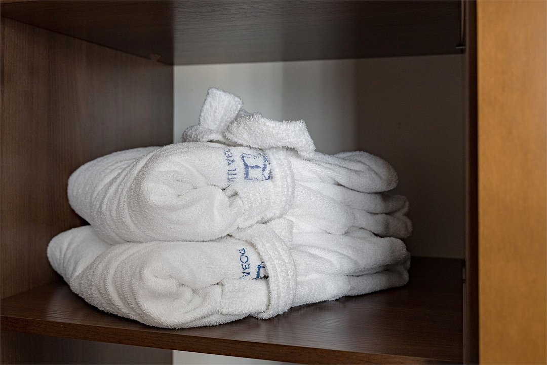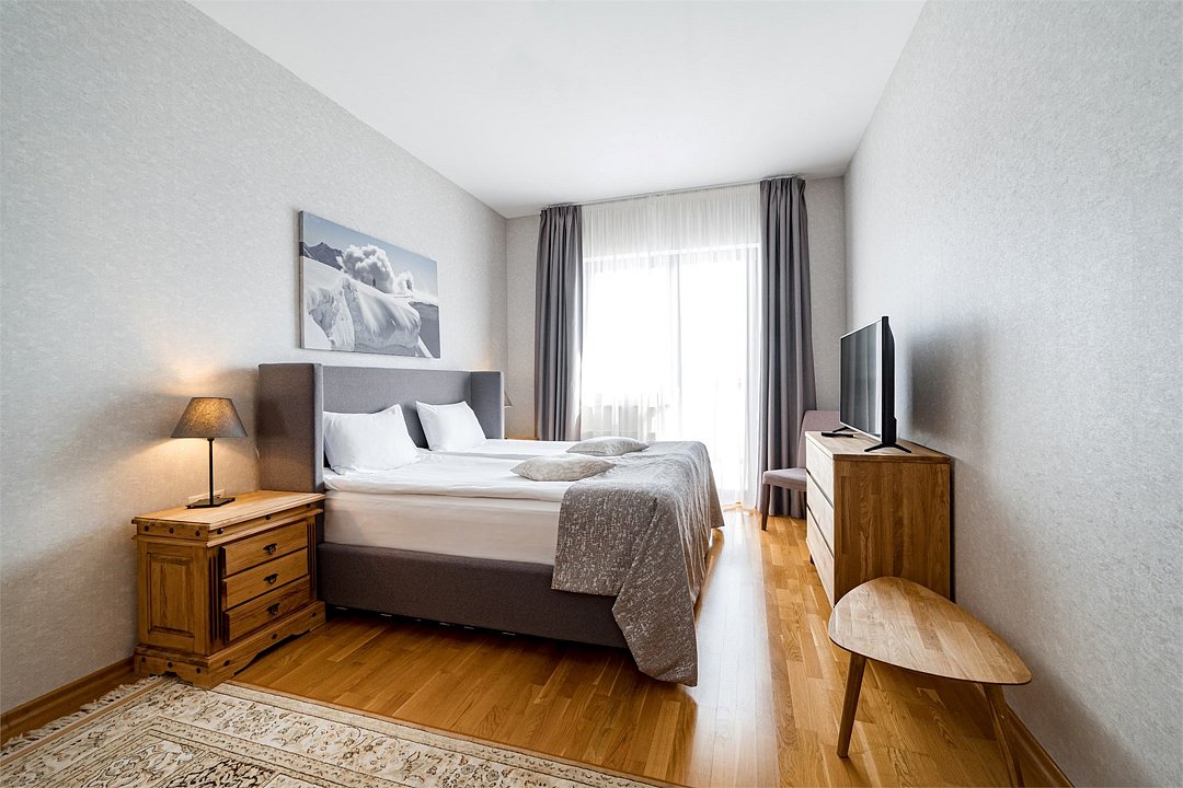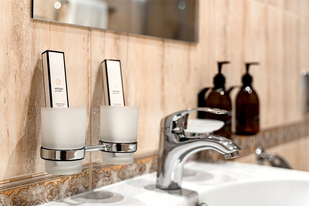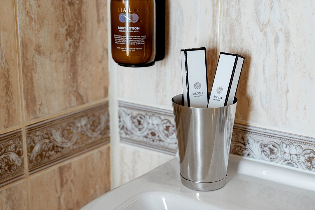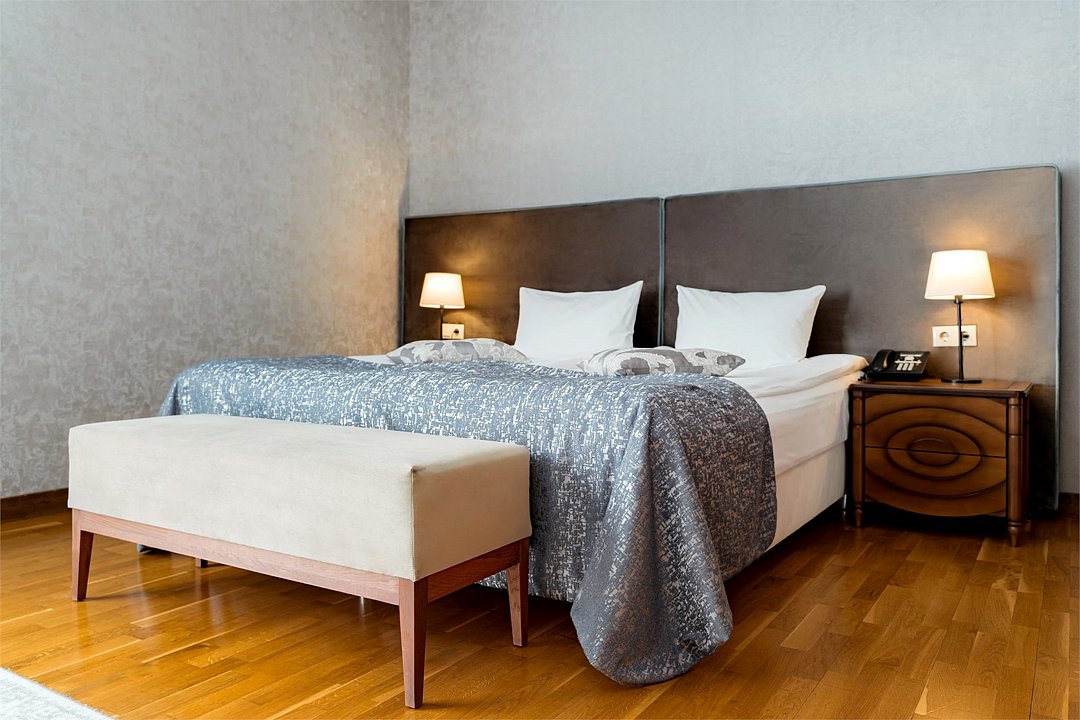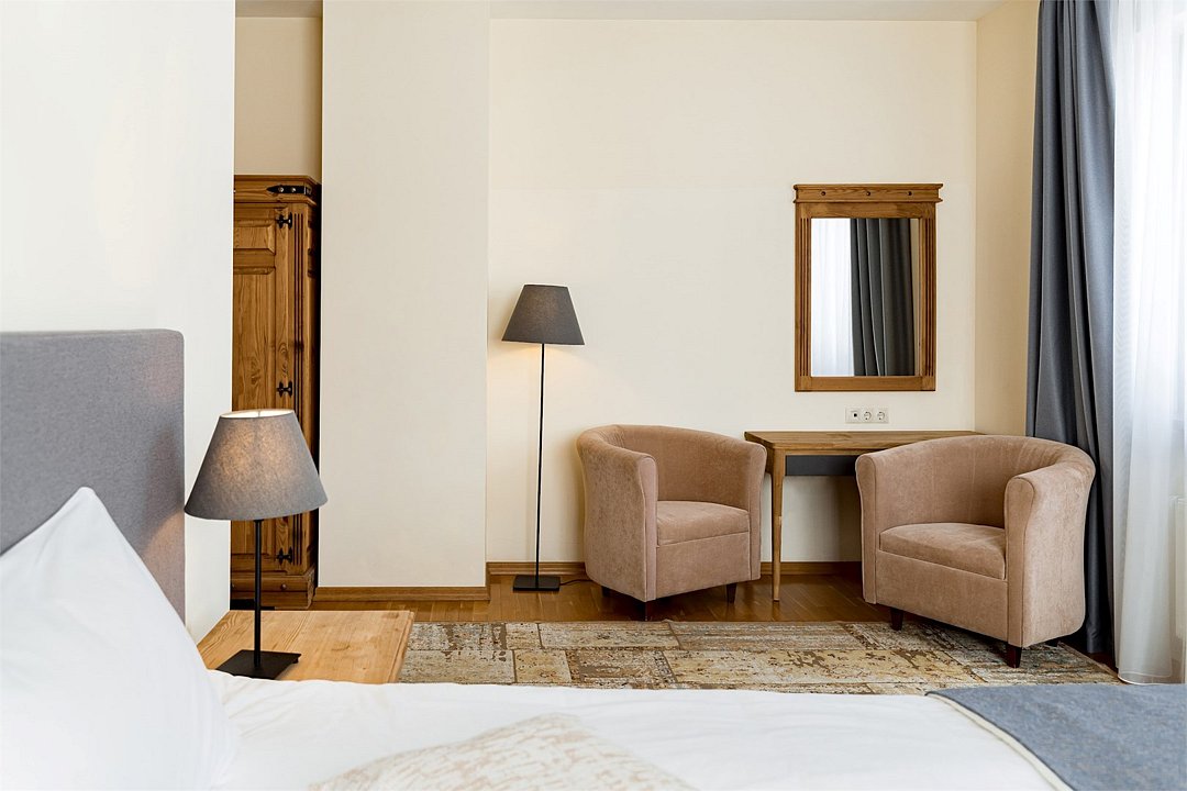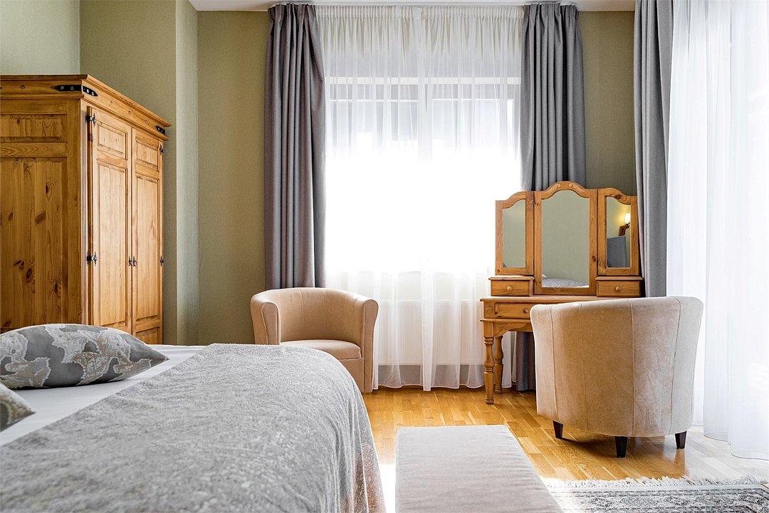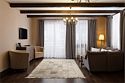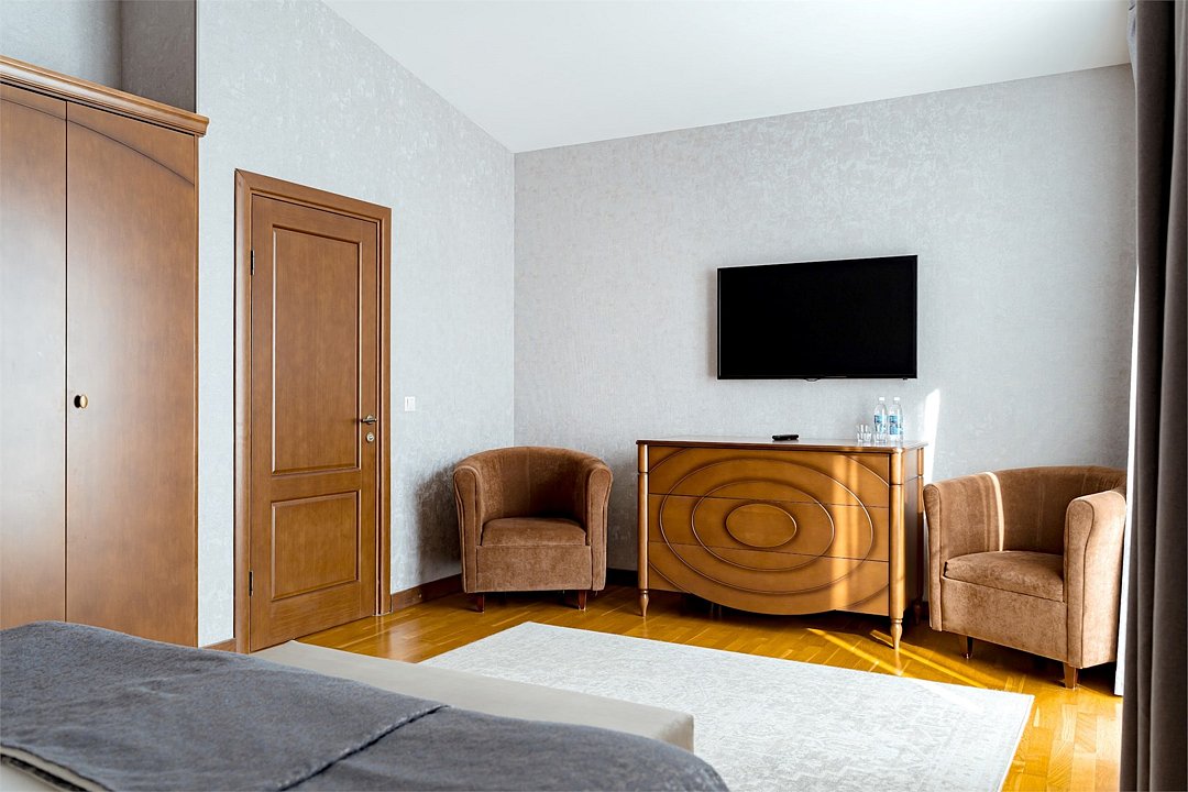 В номере большая двуспальная кровать, ванная комната с натуральной косметикой, комплектом махровых полотенец, халатов и тапочек, большой телевизор и дубовая мебель.