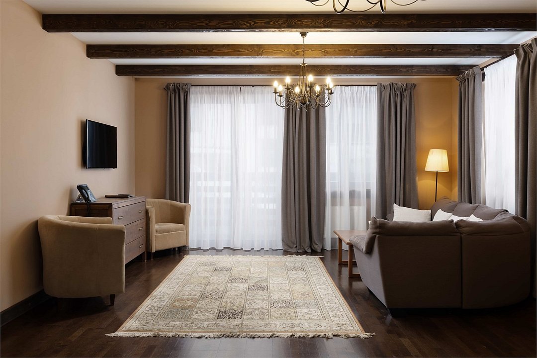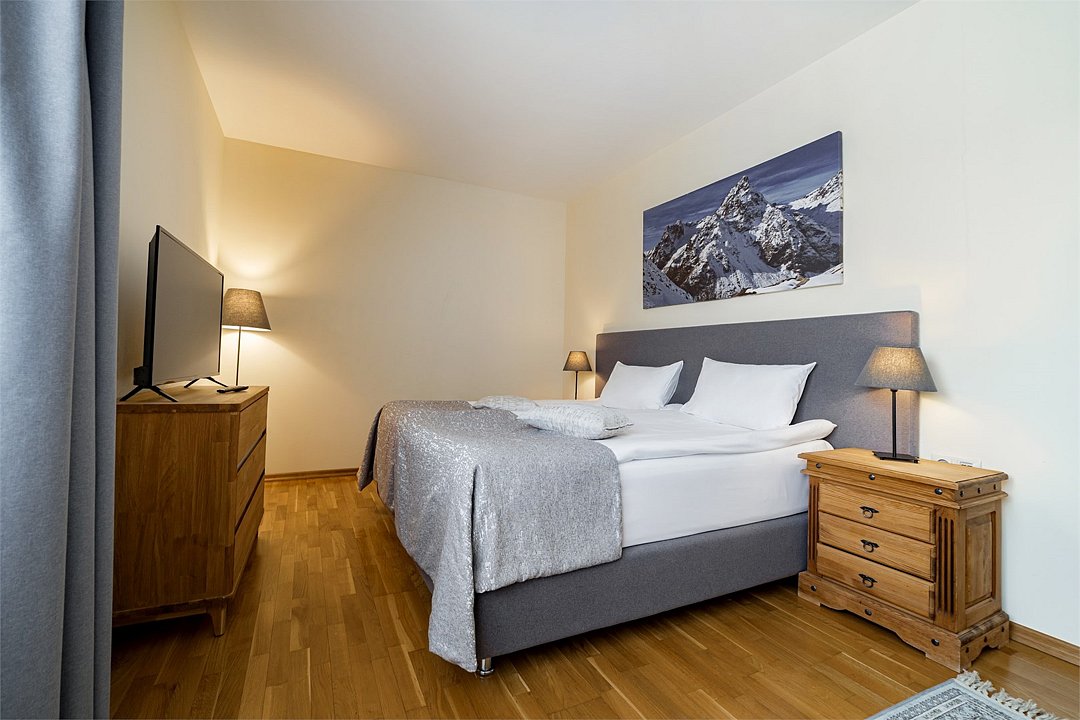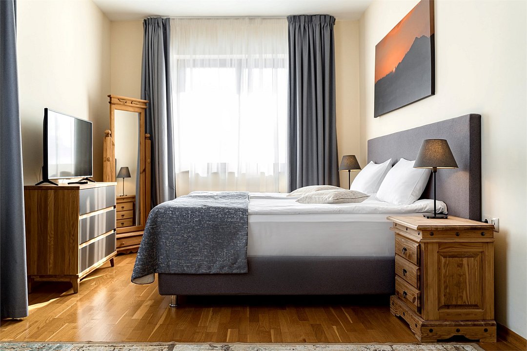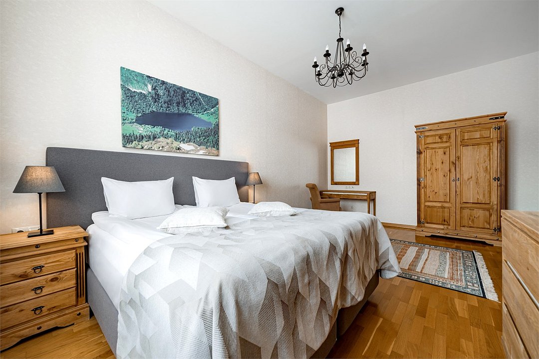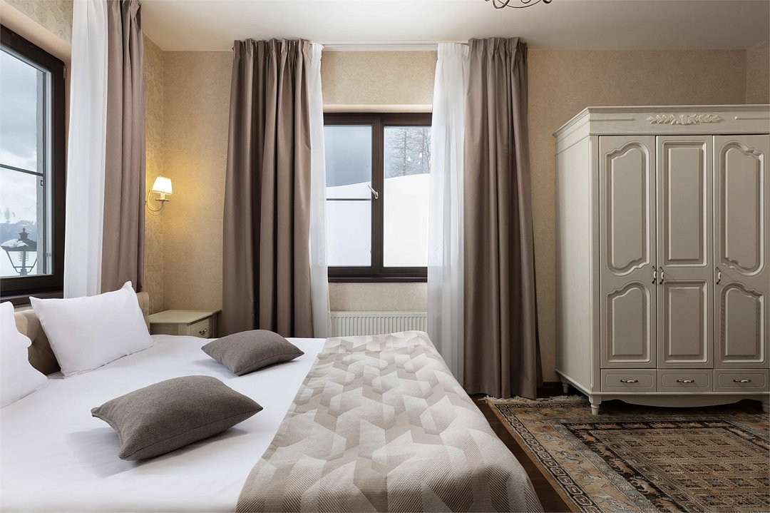 В просторном номере большая двуспальная кровать, ванная комната с натуральной косметикой, комплектом махровых полотенец, халатов и тапочек, большой телевизор и дубовая мебель. С балкона открывается прекрасный вид на горы.