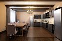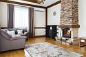 Гостиная с оборудованной кухонной зоной (оснащено мебелью, холодильником, электрической плитой с духовым шкафом, посудомоечной машиной, посудой и столовыми принадлежностями), столовой с камином и балконом.
