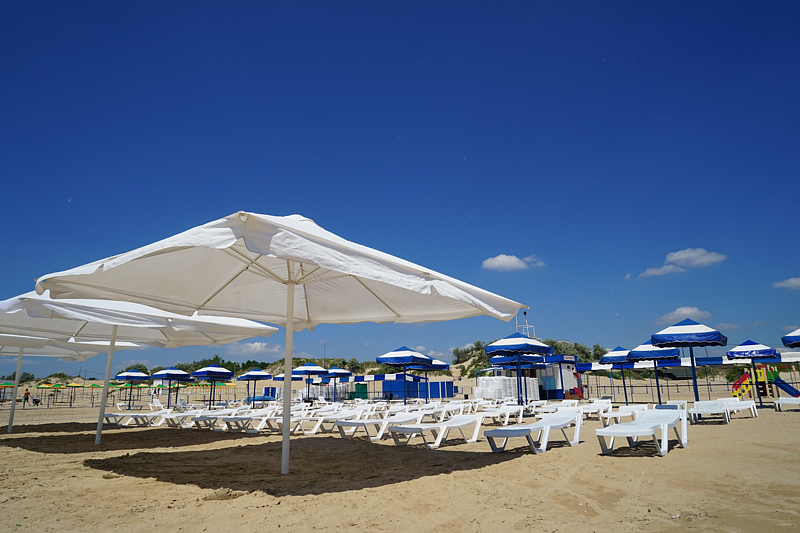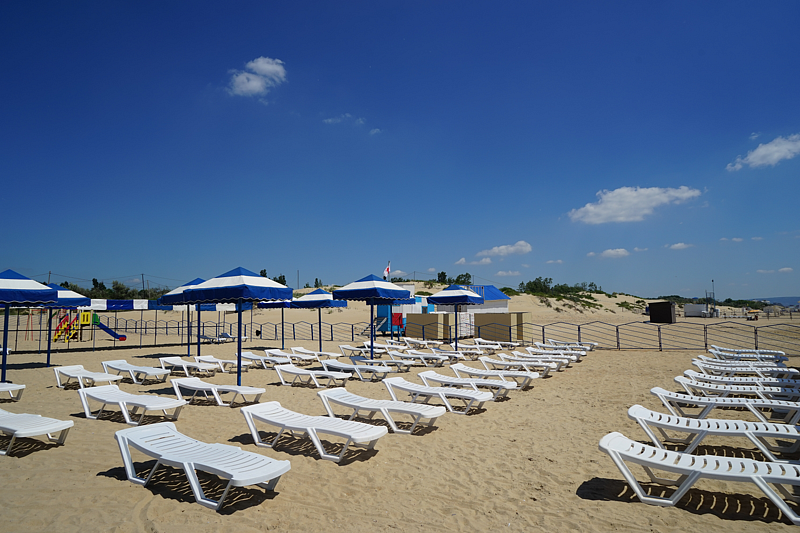 Инфраструктура: лежаки, зонтики, шезлонгиПесчаный пляж