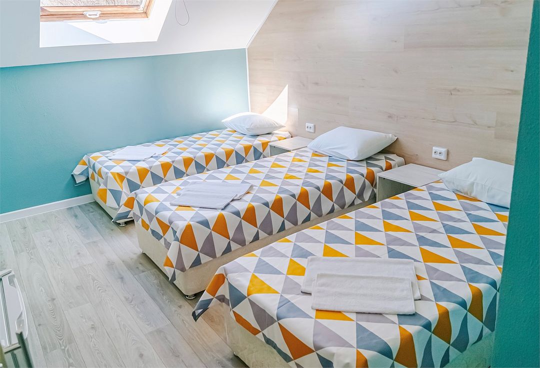 Классический номер мансардного типа: три кровати, комод, тумбочки, вешалка, столик, стулья, эл.чайник, холодильник, кондиционер, телевизор . Cанузел: душ-поддон, унитаз, раковина.Услуги и удобства
