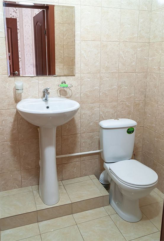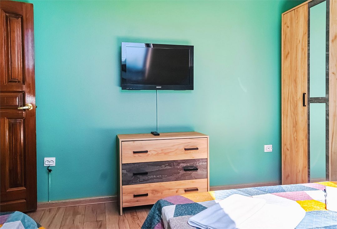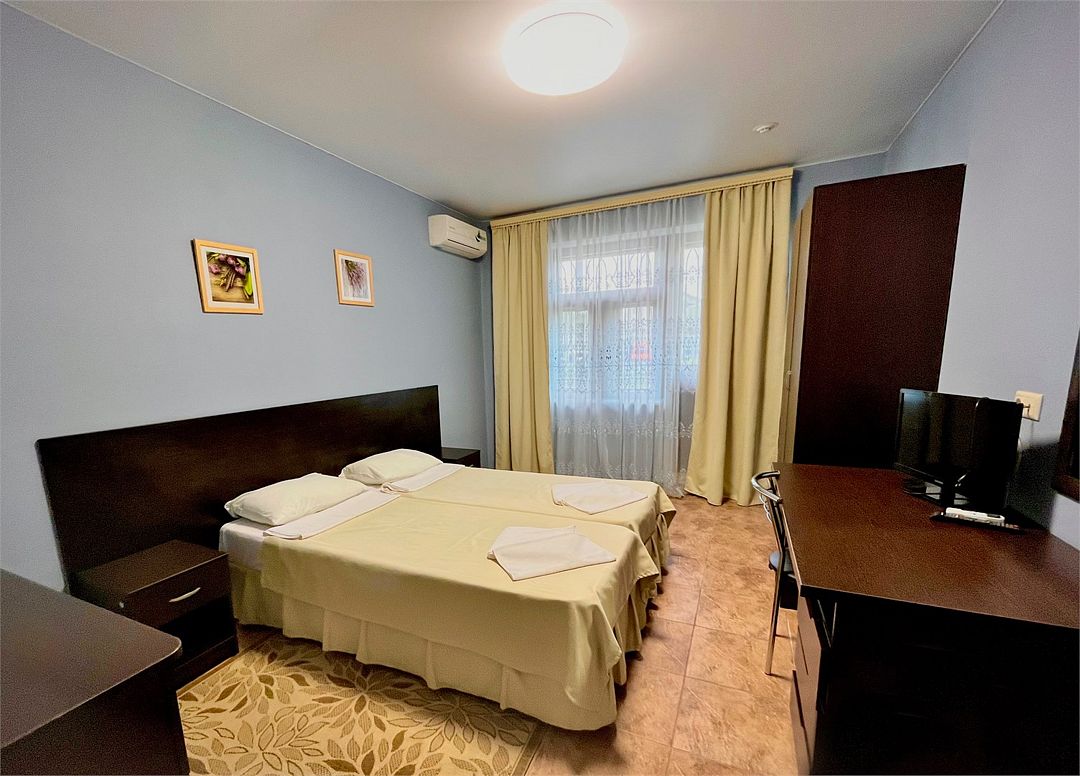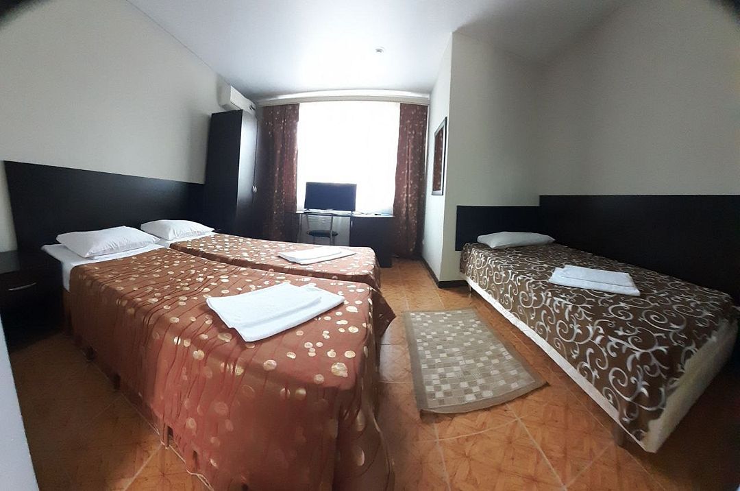 Классический номер: гардеробная, одна 2х спальная кровать, одна односпальная кровать, тумбочки, столик, стулья, телевизор, эл.чайник, холодильник, кондиционер. Cанузел: душ -поддон, унитаз, раковина.Услуги и удобства