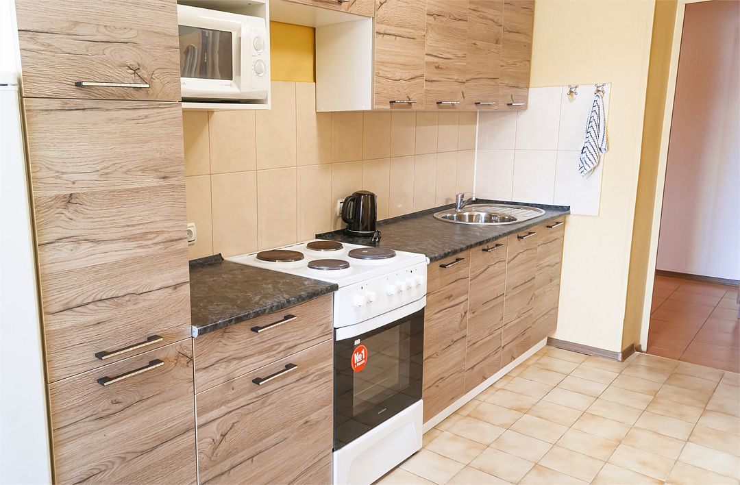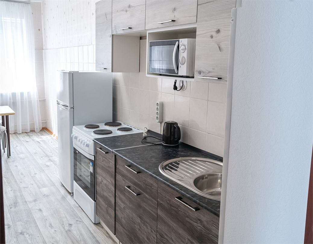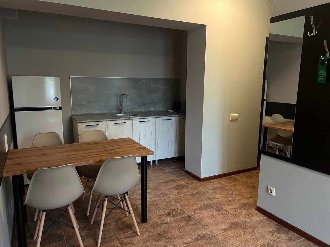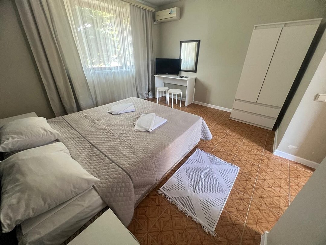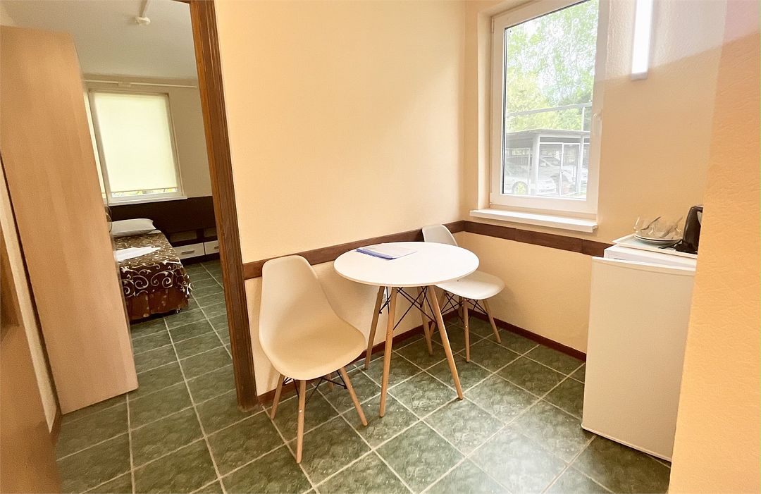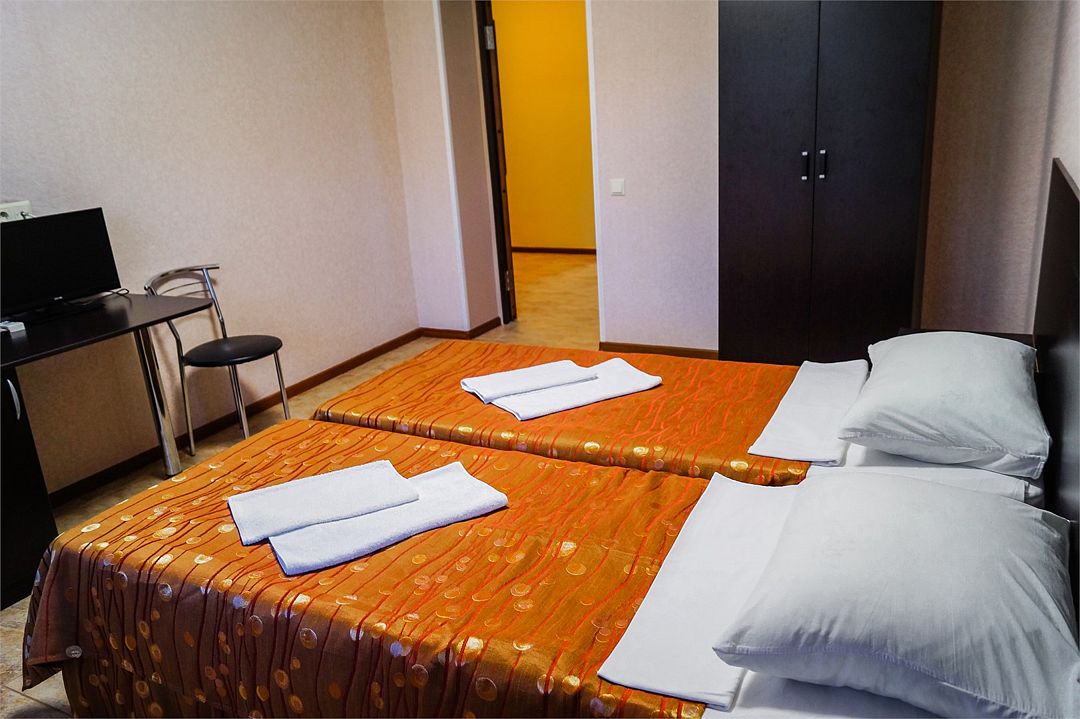Просторный номер: 2х спальная кровать, односпальная кровать,шкаф, тумбочки, телевизор, кондиционер. Кухонный уголок: стол, холодильник, эл.чайникКомфорт 2х местный (корпус 4 , 1 этаж)