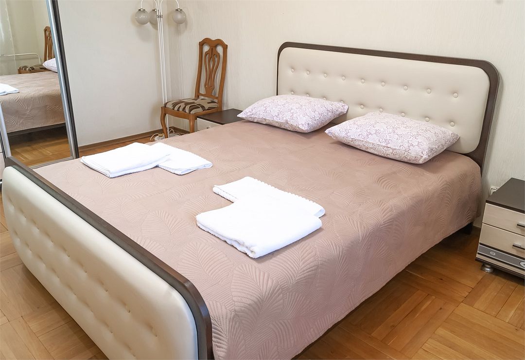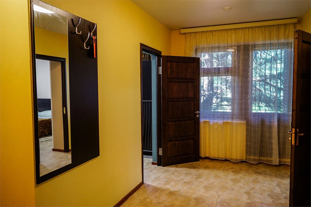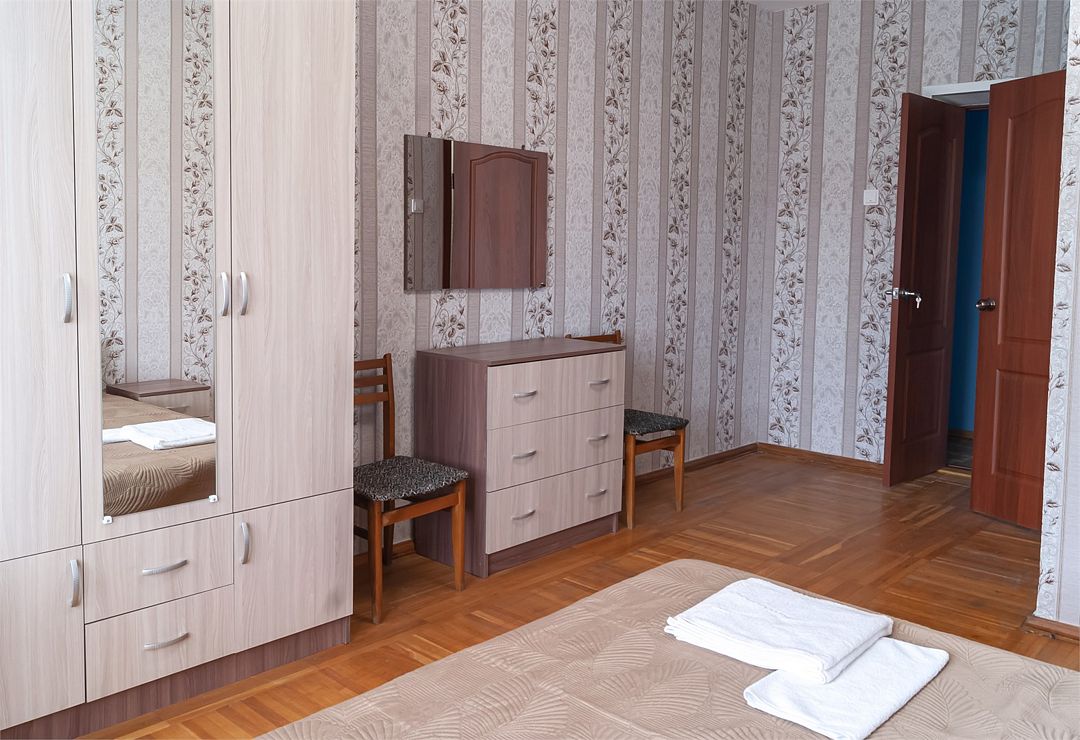 Просторный номер. Гостиная: мягкая мебель, телевизор, журнальный столик, шкаф для одежды, комод, кондиционер. Спальня: большая 2-х спальная кровать, две односпальные кровати, тумбочки. Кухонный уголок: стол, стулья, холодильник, эл.чайник.Услуги и удобства