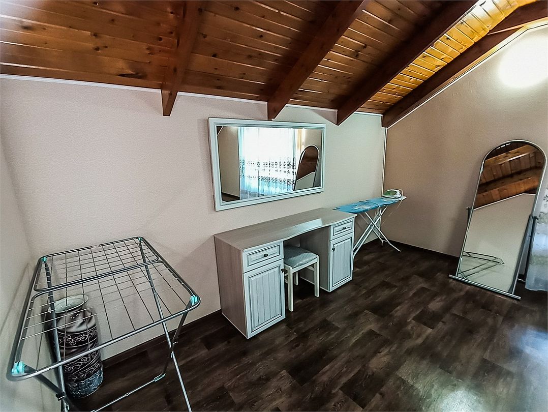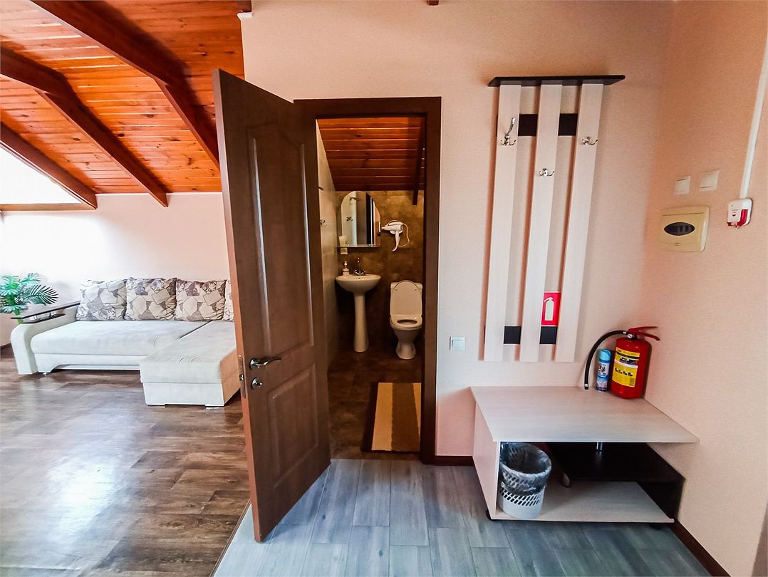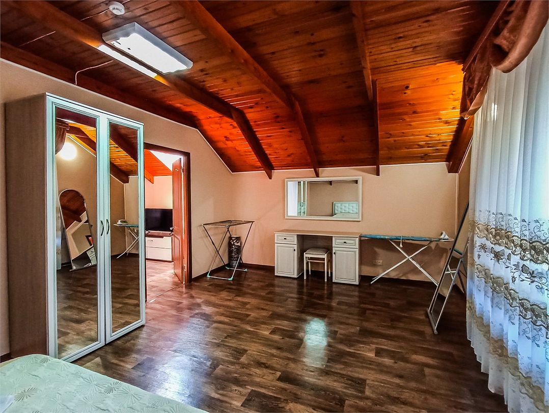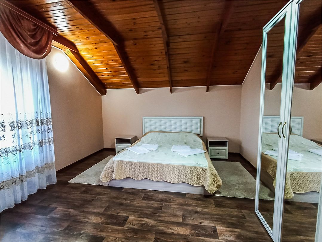 Классический номер мансардного типа: три кровати, комод, тумбочки, вешалка, столик, стулья, эл.чайник, холодильник., телевизор. Cанузел: душ-поддон, унитаз, раковина.Услуги и удобства