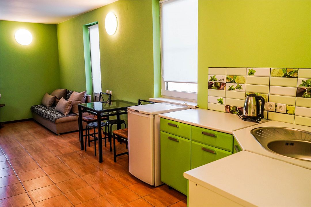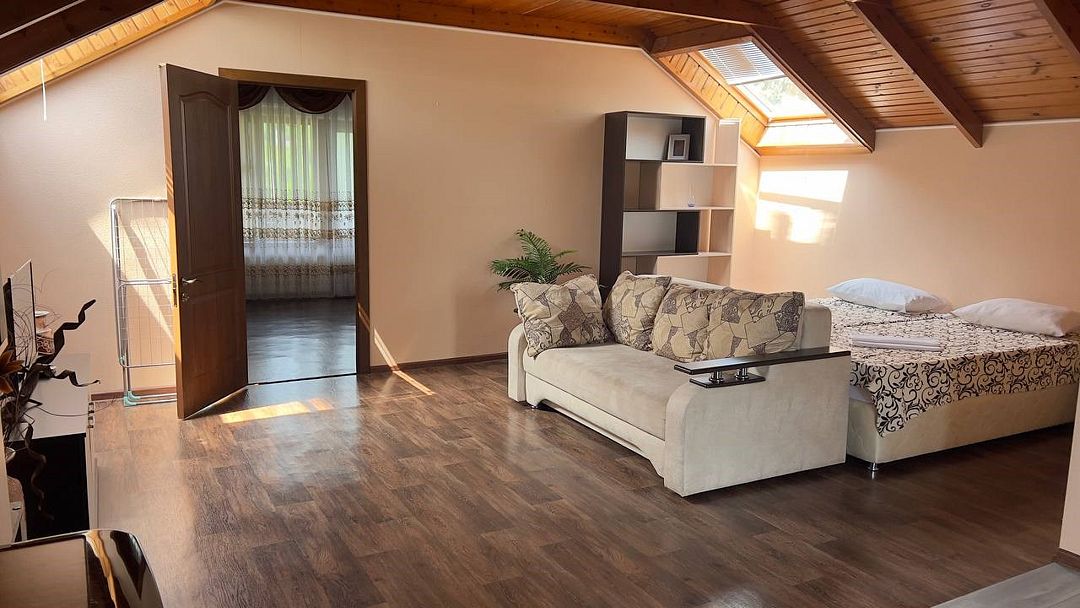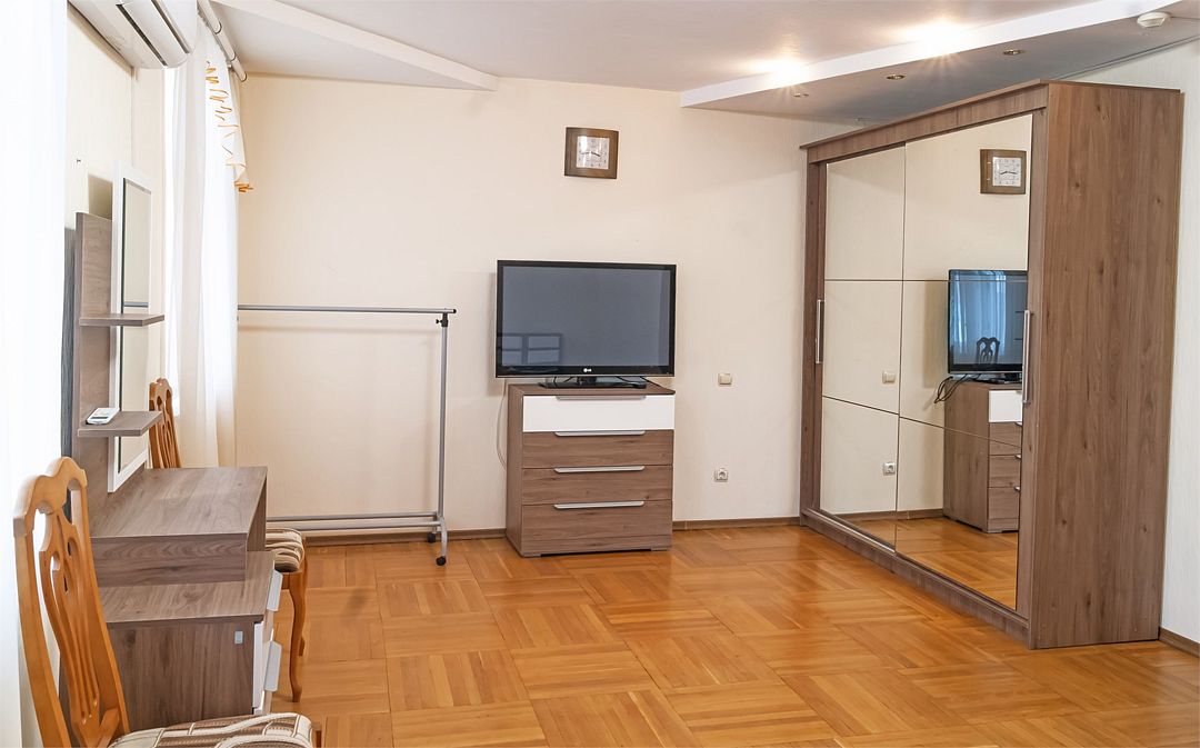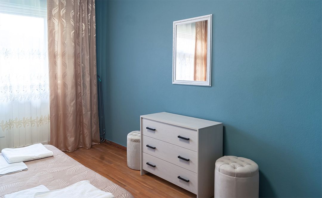 Просторный номер. Гостиная: мягкая мебель, телевизор, журнальный столик, шкаф для одежды, комод, кондиционер. Спальня: большая 2-х спальная кровать, односпальная кровать, тумбочки. Кухонный уголок: стол, стулья, холодильник, эл.чайник.Услуги и удобства