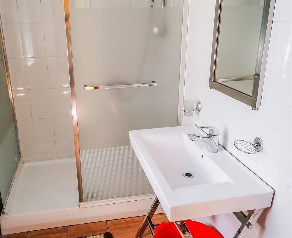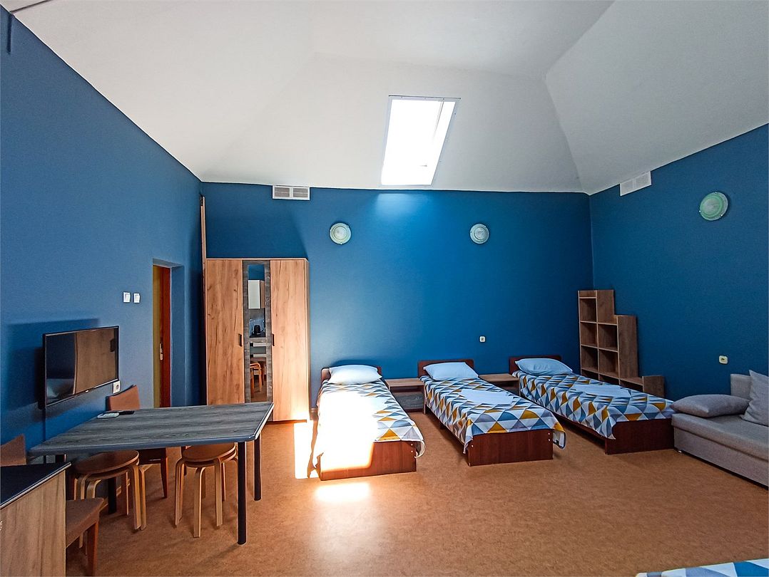 телевизор, холодильник, стулья, шкаф для одежды, обеденный стол, чайник, унитаз, раковина, душ, шесть односпальных кроватей, сплит-система, мансардные окнаВ гостиничном номере