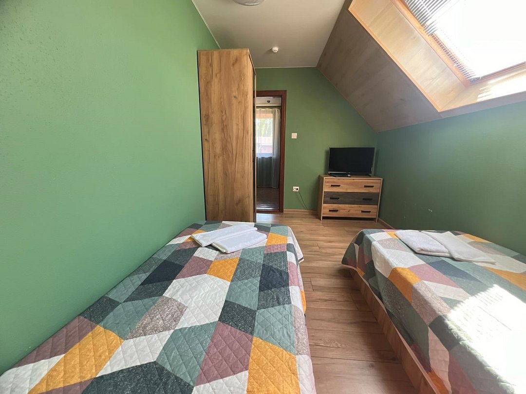 Классический номер мансардного типа: две кровати, комод, тумбочки, вешалка, столик, стулья, эл.чайник, холодильник, кондиционер, телевизор . Cанузел: душ-поддон, унитаз, раковина.Услуги и удобства