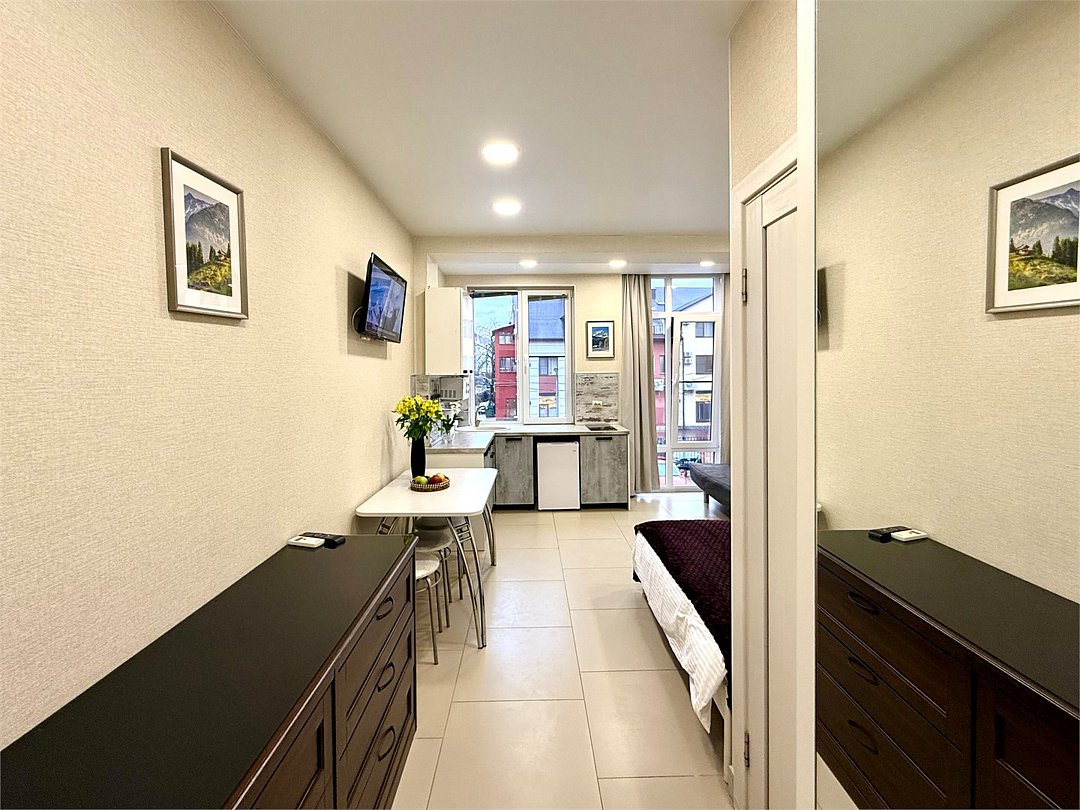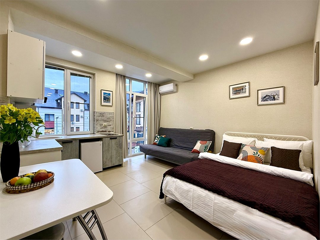 Апартаменты № 24 «Комфорт»: уют и удобство в сердце курорта Откройте для себя идеальное место для отдыха — евродвушку площадью 27 кв. м на втором этаже уютного трёхэтажного дома. Апартаменты рассчитаны на комфортное размещение семьи или небольшой компании до четырёх человек. Что вас ждёт: стильная гостиная‑кухня и уютная спальня; современная двуспальная кровать (140×200 см) и удобный диван‑кровать (140×200 см); полностью оборудованная мини‑кухня: индукционная плита, микроволновая печь, электрочайник, холодильник, посуда и кухонная утварь; кондиционер и система «тёплый пол» (работает в отопительный сезон); стиральная машина, утюг с гладильной доской, фен; телевизор и высокоскоростной Wi‑Fi; современный санузел. Особенности апартаментов Окна апартаментов выходят на соседнее здание — это обеспечивает дополнительную тишину и спокойствие, защищая пространство от излишнего уличного шума и суеты. При этом все ключевые достопримечательности и объекты инфраструктуры остаются в шаговой доступности. Преимущества расположения: всего 15 минут пешком до главной канатной дороги «Горки Город» и ключевых объектов Курорта Красная Поляна (или пара минут на автобусе); в шаговой доступности — казино «Сочи» и концертно‑развлекательная площадка «RED‑арена»; рядом магазины «Магнит» и «Пятёрочка», столовые «Патисон» и «Всё ли Поели»; удобная остановка общественного транспорта «Мегафон»; бесплатная придомовая парковка. Простое и безопасное заселение Мы используем удобную бесконтактную систему заселения. Код доступа к апартаментам вы получите после: подписания онлайн‑договора аренды; прохождения онлайн‑регистрации (по паспорту); внесения предоплаты; В объекте берётся залог в размере 5 000 рублей (возвращается в течение 1–5 рабочих дней после выезда и проверки апартаментов). Приезжайте и оцените комфорт и функциональность апартаментов № 24 «Комфорт»!Услуги и удобства