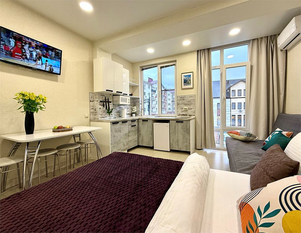 Апартаменты № 33 «Комфорт» — уют и функциональность с собственным балконом Познакомьтесь с элегантной «евродвушкой» площадью 29 кв. м на втором этаже трёхэтажного дома. Пространство грамотно зонировано: просторная гостиная‑кухня, уютная спальня и современный санузел. Особая изюминка — собственный балкон, где можно наслаждаться утренним кофе или вечерними закатами. Идеально для: - пары или семьи до 4 человек; - небольшой компании друзей. Спальные места: - двуспальная кровать (140×200 см); - диван‑кровать (140×200 см). Всё для комфортного проживания: - полностью оборудованная мини‑кухня (индукционная плита, микроволновка, электрочайник, холодильник, посуда и кухонная утварь); - современная техника (телевизор, кондиционер, стиральная машина); удобства для быта (утюг, гладильная доска, фен); - бесплатный Wi‑Fi; - туалетные принадлежности; - система «тёплый пол» (работает в отопительный сезон). Дополнительные преимущества: - собственный балкон для отдыха; - бесплатная придомовая парковка (размещение по наличию свободных мест); - бесконтактная система заселения — быстро, удобно и безопасно. Рядом с апартаментами: - казино «Сочи»; - концертно‑развлекательная площадка «RED‑арена»; - магазины «Магнит» и «Пятёрочка»; - столовые «Патисон» и «Все ли Поели»; - остановка общественного транспорта «Мегафон». До главных достопримечательностей: - канатная дорога «Горки Город» — 15 мин пешком или несколько минут на автобусе; - объекты инфраструктуры курорта «Красная Поляна» — в пределах 15 мин ходьбы. Условия заселения: 1. Подписание онлайн‑договора аренды. 2. Прохождение онлайн‑регистрации (по паспорту). 3. Внесение предоплаты. 4. Залог — 5 000 рублей (возвращается в течение 1–5 рабочих дней после выезда и проверки апартаментов).Услуги и удобства