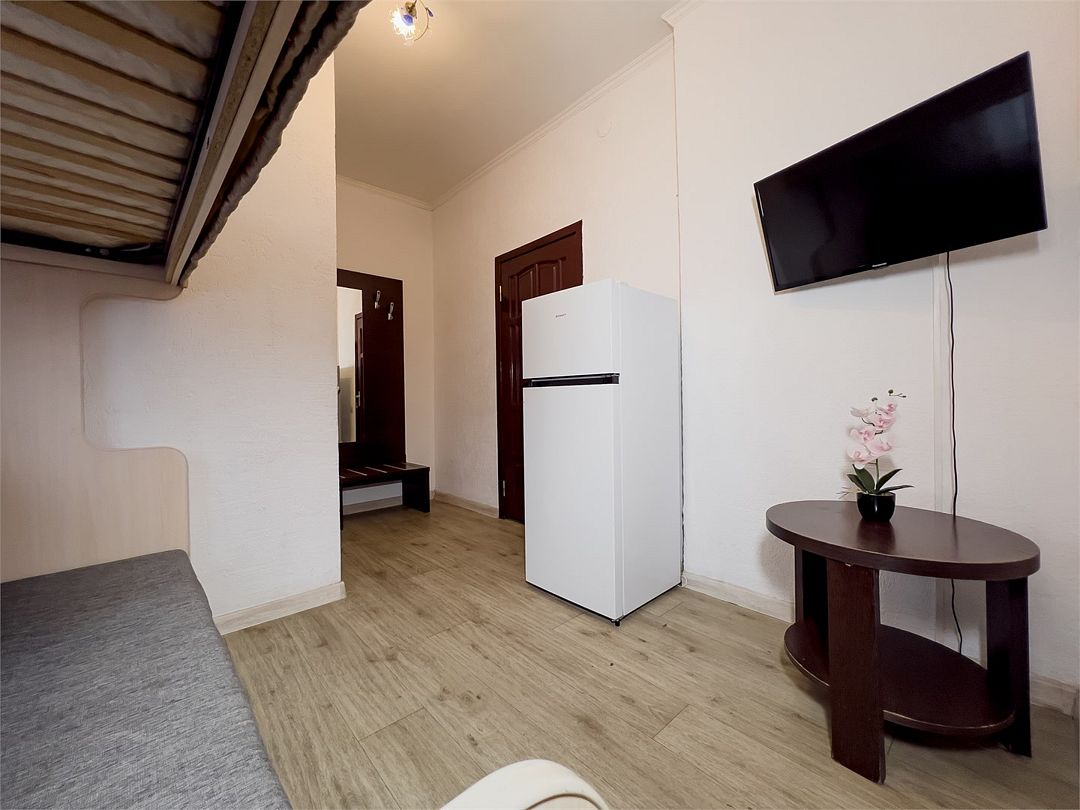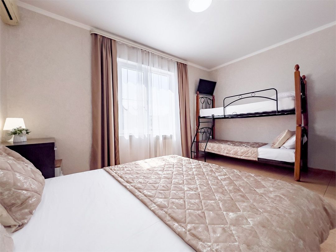 Просторный семейный номер для вашего комфортного отдыха! Идеальное решение для семьи или компании друзей — наш двухкомнатный номер создан специально для тех, кто ценит комфорт и уют. Почему стоит выбрать этот номер? ✔ Простор и удобство — две отдельные комнаты с двуспальной кроватью и двухъярусной кроватью (нижний ярус — удобный диван-кровать). Вместимость — до 5 человек. ✔ Все для комфорта — плазменный телевизор, холодильник, кондиционер, шкаф для вещей и тумбочки. ✔ Собственная ванная комната — душ и туалетные принадлежности. ✔ Общая кухня — всё необходимое для приготовления любимых блюд: электроплита, микроволновка, чайник и полный набор посуды. ✔ Дополнительные удобства— гладильная доска и утюг. Номер расположен на втором этаже — тихо, уютно и комфортно. Здесь вы почувствуете себя как дома. Приезжайте и наслаждайтесь отдыхом в приятной атмосфере!Услуги и удобства