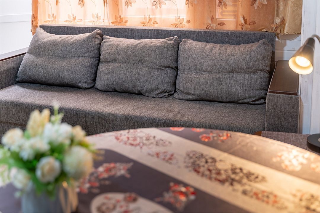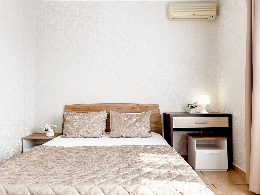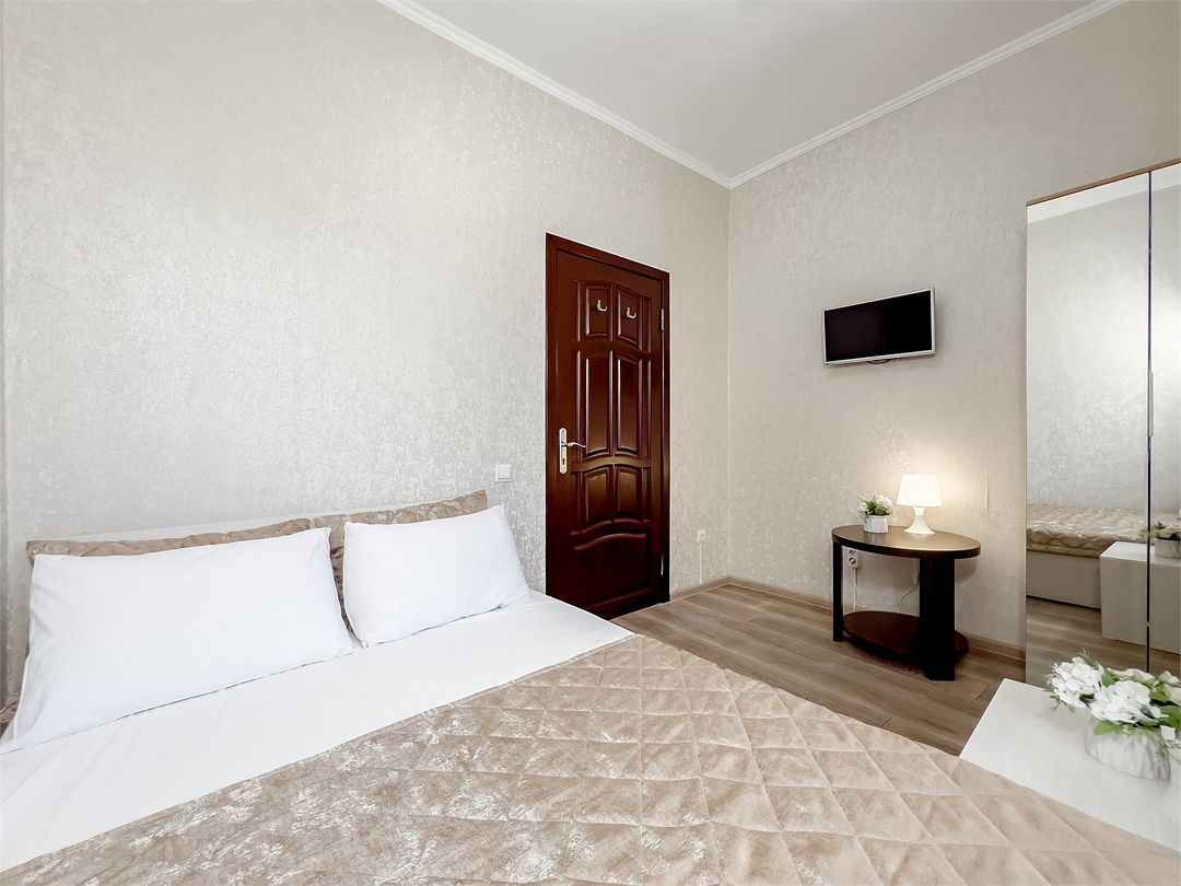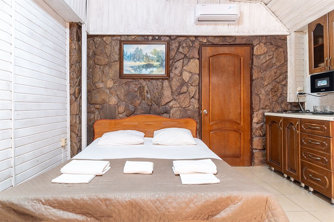 Студия с кухней. Номер рассчитан для размещения четырех гостей на двуспальной кровати и диван-кровати. Номер расположен на первом этаже. Светлый, уютный номер меблирован шкафом для одежды, тумбочками, кухонным столом, стульями. Для гостей имеется плазменный телевизор и кондиционер. Так же для удобства гостей имеется кухня с холодильником, электроплитой, чайником, микроволновой печью, необходимым набором посуды. Собственная ванная комната оснащена душем и туалетными принадлежностями. В пользовании гладильная доска и утюг.Услуги и удобства