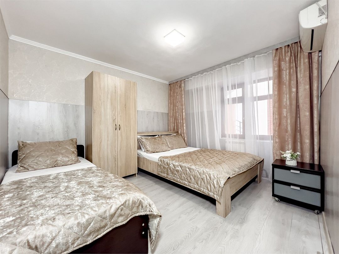 кабельное телевидение, Wi-Fi, кондиционер, фен, утюг, обогреватель, ванна, санузел, двуспальная кровать, тумбы, стулья, шкаф для одежды, вешалки, зеркало, кухня, набор посуды, стиральная машина, чайник, раковина, отопление, две спальни, вид во двор, четыре односпальные кровати, стул, стол, туалет, телевизор с плоским экраном, можно с питомцамиВ апартаментах