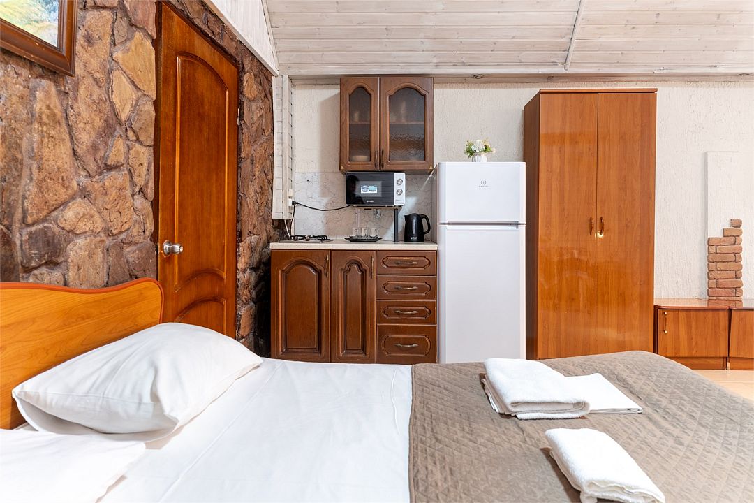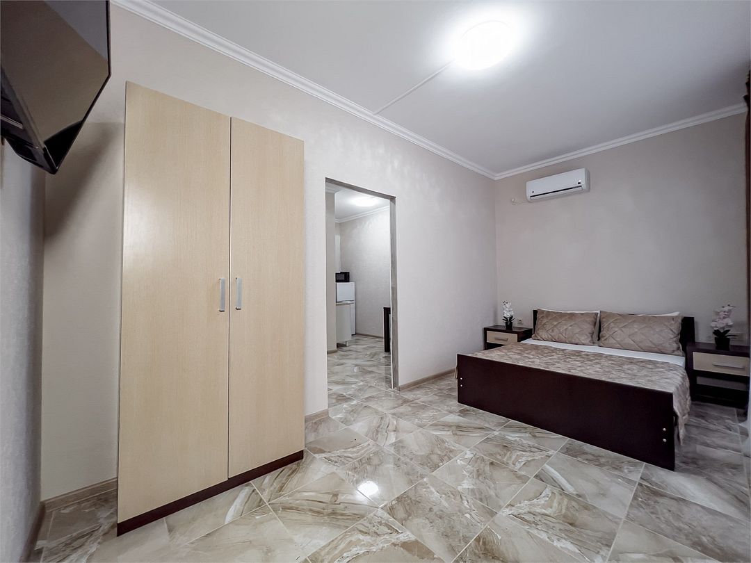 Апартаменты студия с кухней. Номер рассчитан для размещения четырех гостей на двуспальной кровати и диван- кровати. Номер расположен на первом этаже. Светлый, уютный номер меблирован шкафом для одежды, тумбочками, кухонным столом, стульями. Для гостей имеется плазменный телевизор и кондиционер. Так же для удобства гостей имеется кухня с холодильником, электроплитой, чайником, микроволновой печью, необходимым набором посуды. Собственная ванная комната оснащена душем и туалетными принадлежностями. В пользовании гладильная доска и утюг.Услуги и удобства