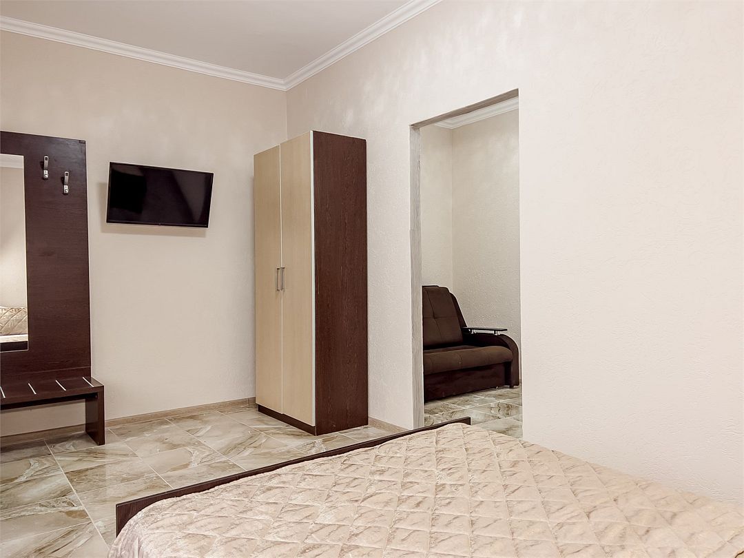 Апартаменты с 1 спальней и кухней. Номер рассчитан для размещения трех гостей на двуспальной и односпальной кроватях. Расположен на первом этаже. Светлый, уютный номер меблирован шкафом для одежды, тумбочками, кухонным столом, стульями. Для гостей имеется плазменный телевизор и кондиционер. Так же для удобства гостей имеется кухня с электроплитой, чайником, микроволновой печью, необходимым набором посуды. Собственная ванная комната оснащена душем и туалетными принадлежностями. В пользовании гладильная доска и утюг.Услуги и удобства