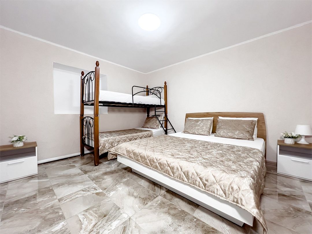 Светлые, уютные апартаменты с двумя спальнями для шести гостей расположены на первом этаже, меблированы шкафом для одежды, тумбочками, кухонным столом, стульями. Гости могут разместиться на двуспальной, двух односпальных и двухъярусной кроватях. Для гостей имеется плазменный телевизор и кондиционер. Так же для удобства есть кухня с холодильником, электроплитой, чайником, микроволновой печью, необходимым набором посуды. Собственная ванная комната оснащена ванной и туалетными принадлежностями. В пользовании гладильная доска и утюг.Услуги и удобства