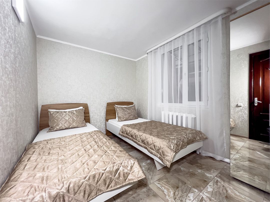 Стандартный двухместный номер с общей ванной комнатой. Уютный светлый номер на втором этаже для комфортного размещения двух гостей. В вашем распоряжении: • Две удобные односпальные кровати • Телевизор • Кондиционер • Мебель: шкаф, тумбочка, журнальный столик Общие удобства: • Общая кухня с газовой плитой, микроволновкой, чайником и посудой • Гладильные принадлежности Идеальный выбор для путешественников, ценящих комфорт и уют.Услуги и удобства