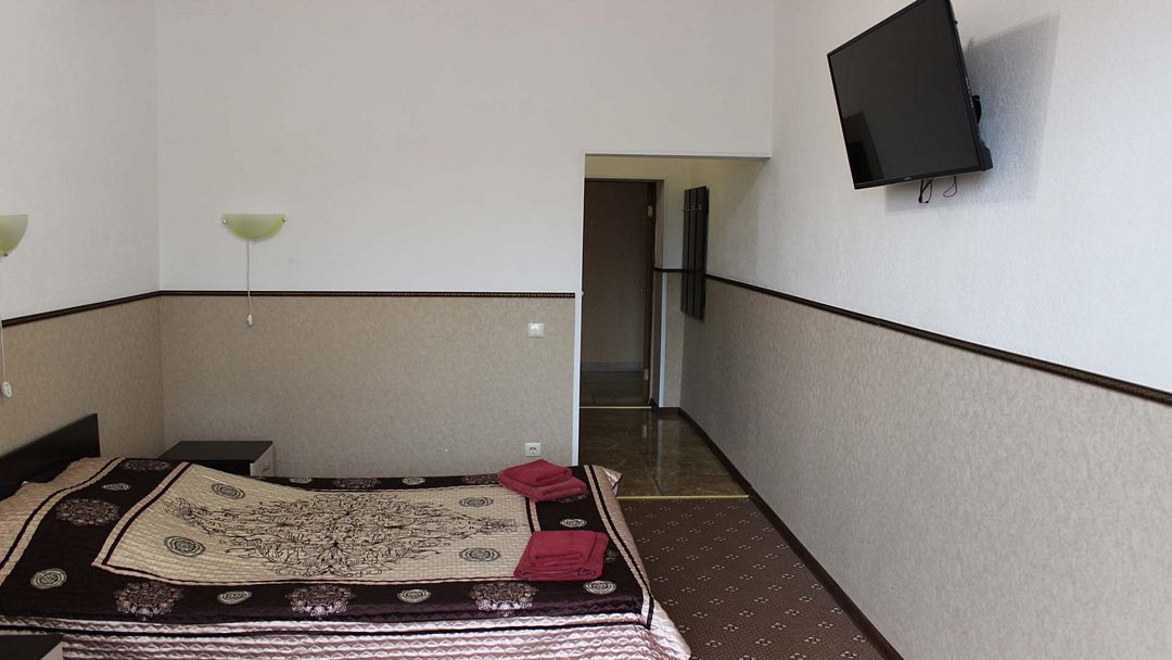 В номере: 2 односпальные кровати/двуспальная кровать, прикроватные тумбочки, раскладной диван (доп. место), стол, шкаф, зеркало, кондиционер, телевизор, холодильник, набор посуды. В ванной комнате: ванна, полотенца.