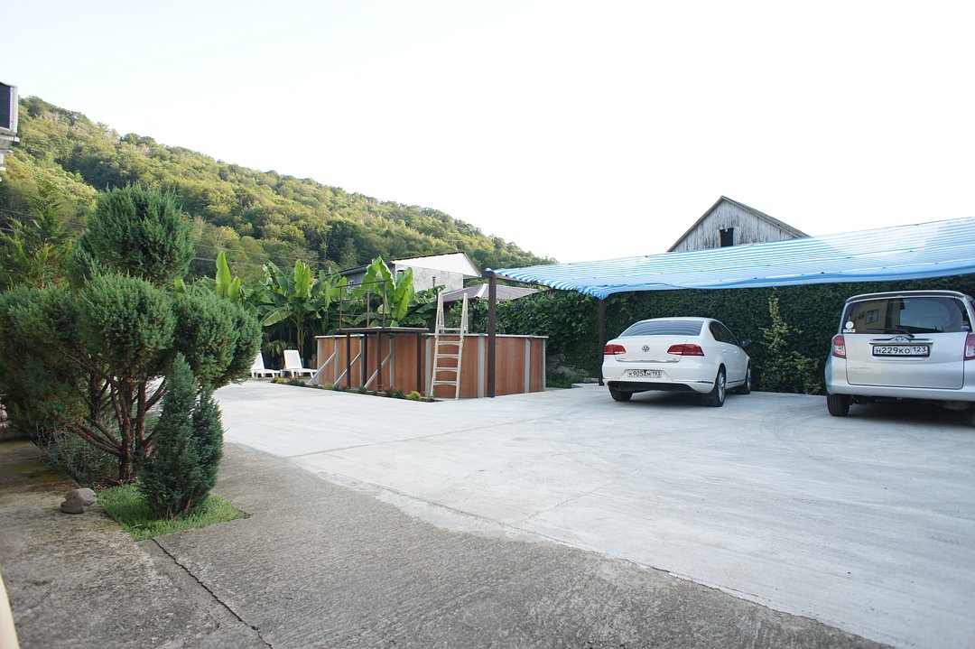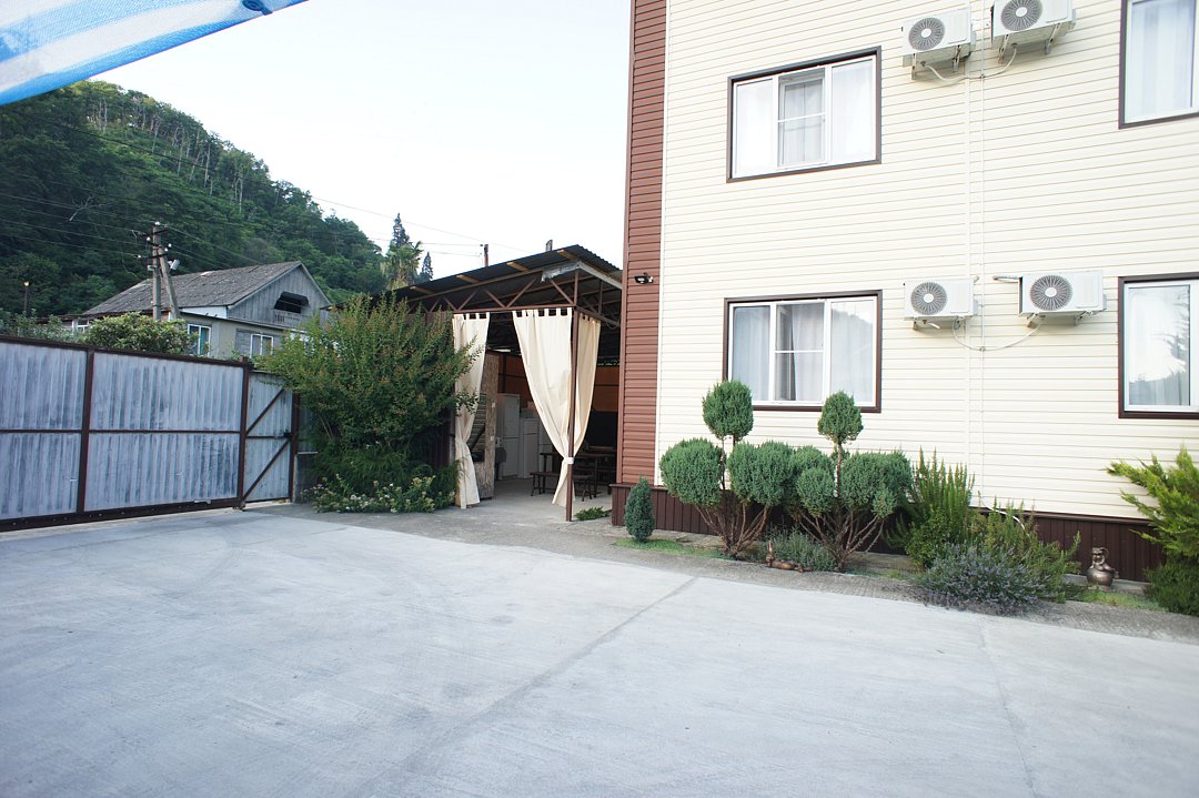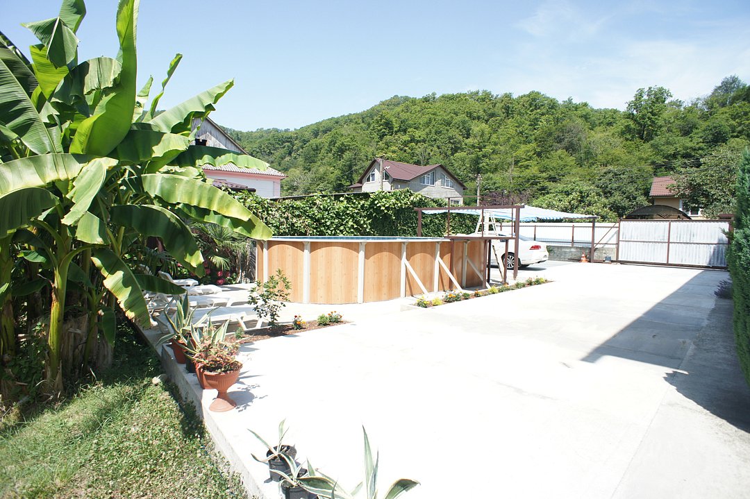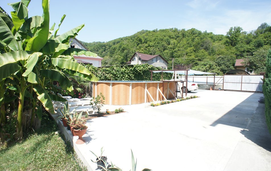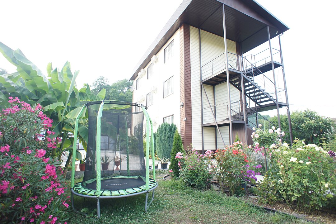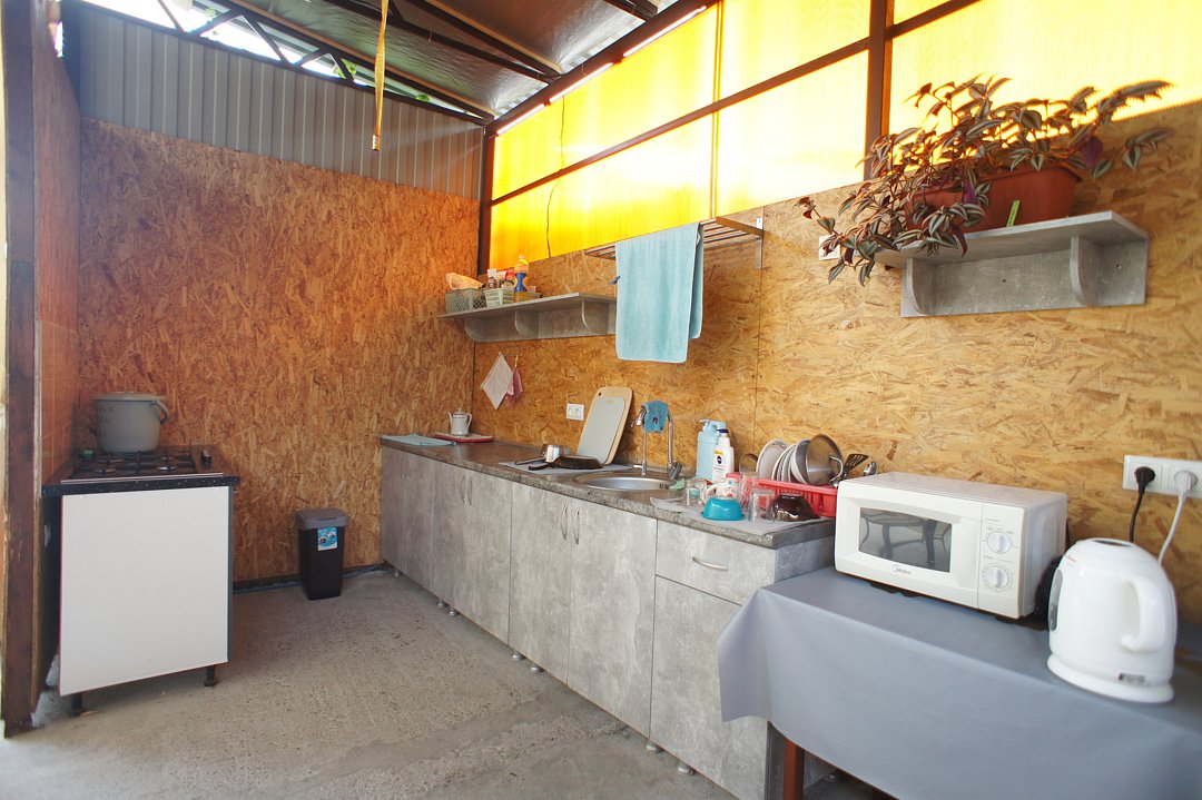 На территории гостевого дома оборудованы: полностью оборудованная кухня-беседка общего пользования, беседка с мангалом, парковка во дворе и рядом с домом, открытый бассейн, шезлонги, интернет Wi-Fi, детская площадка, батут для детей.