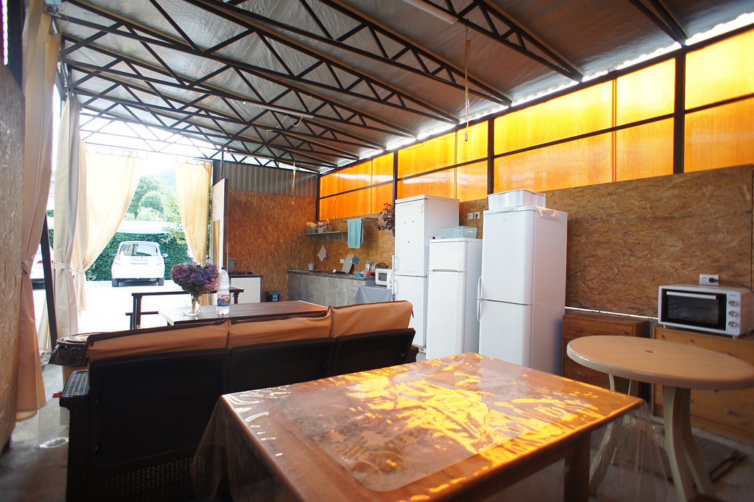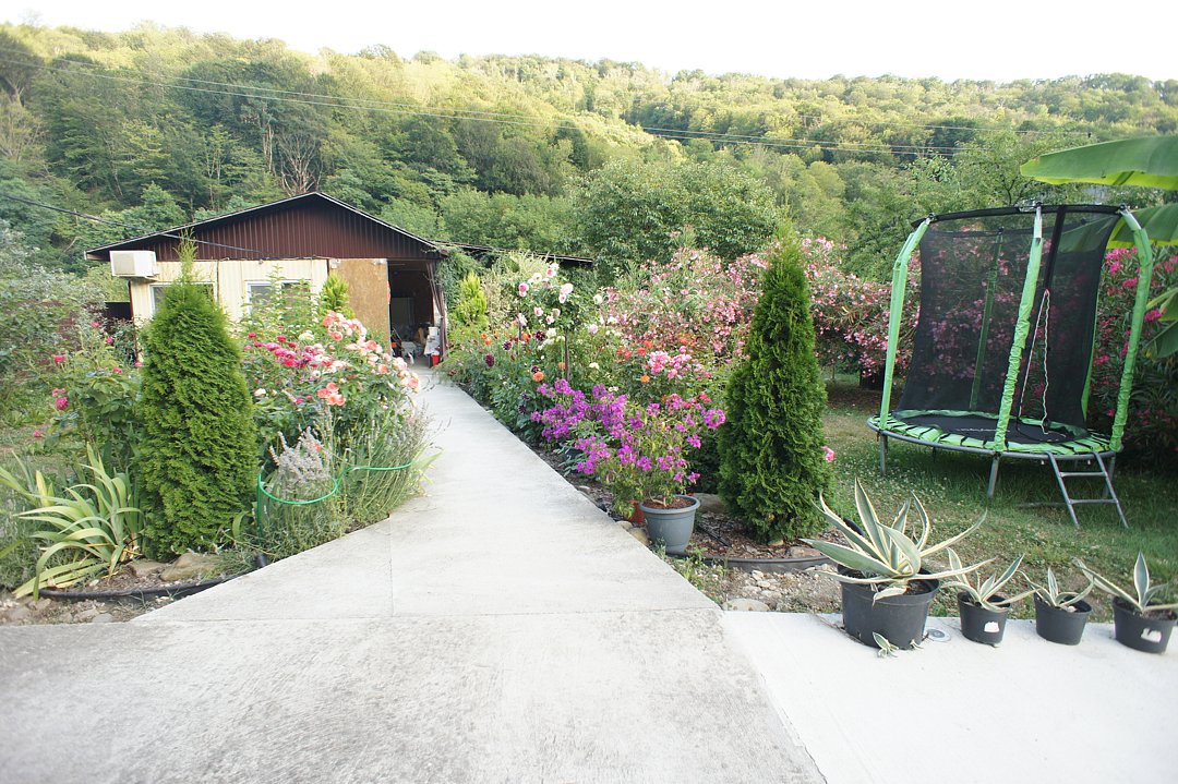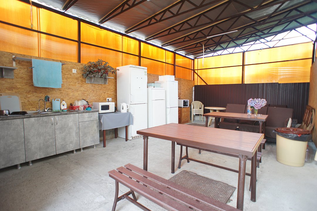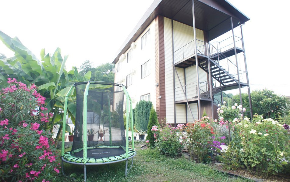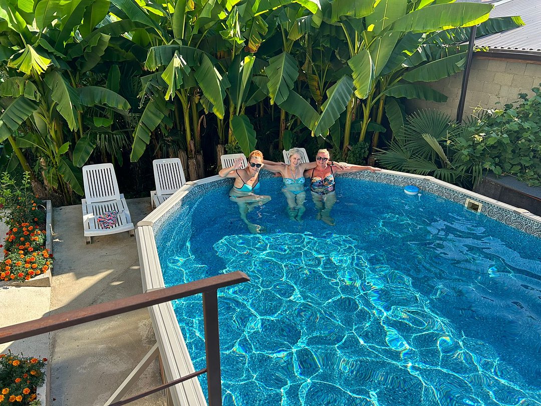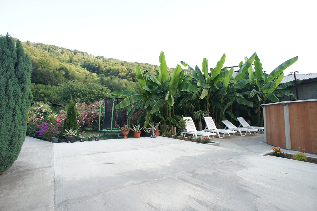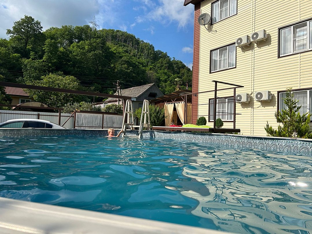 На территории гостевого дома оборудованы: полностью оборудованная кухня-беседка общего пользования, беседка с мангалом, парковка во дворе и рядом с домом, открытый бассейн, шезлонги, интернет Wi-Fi, детская площадка, батут для детей.