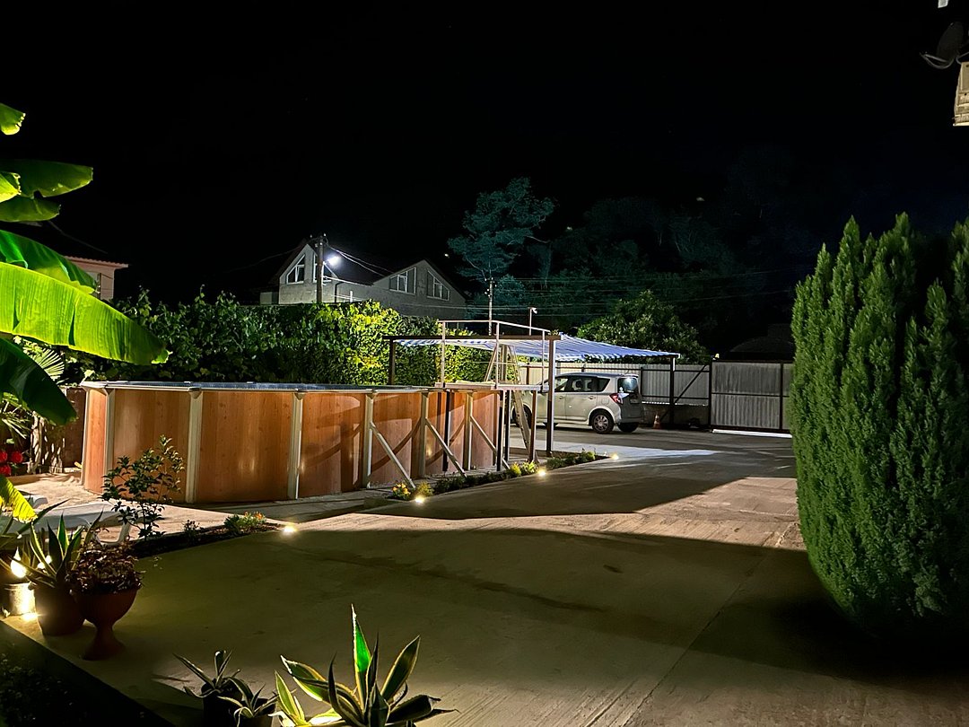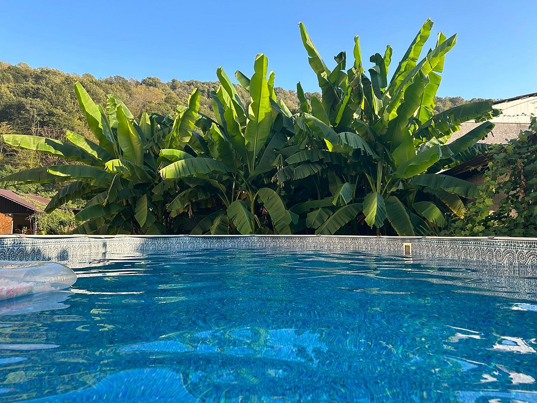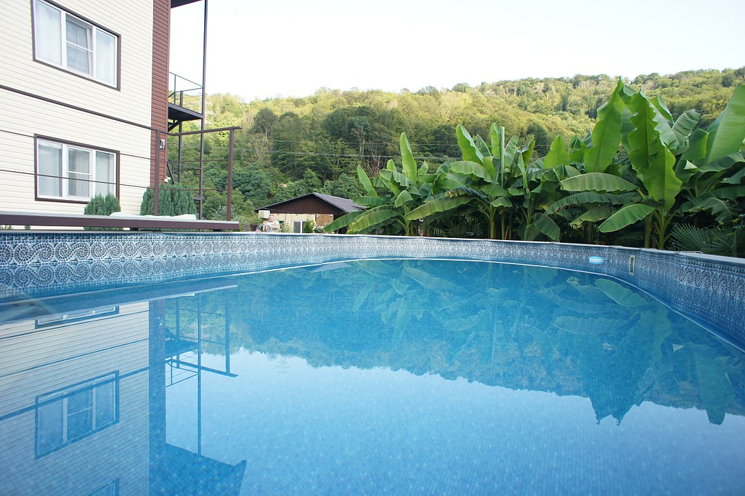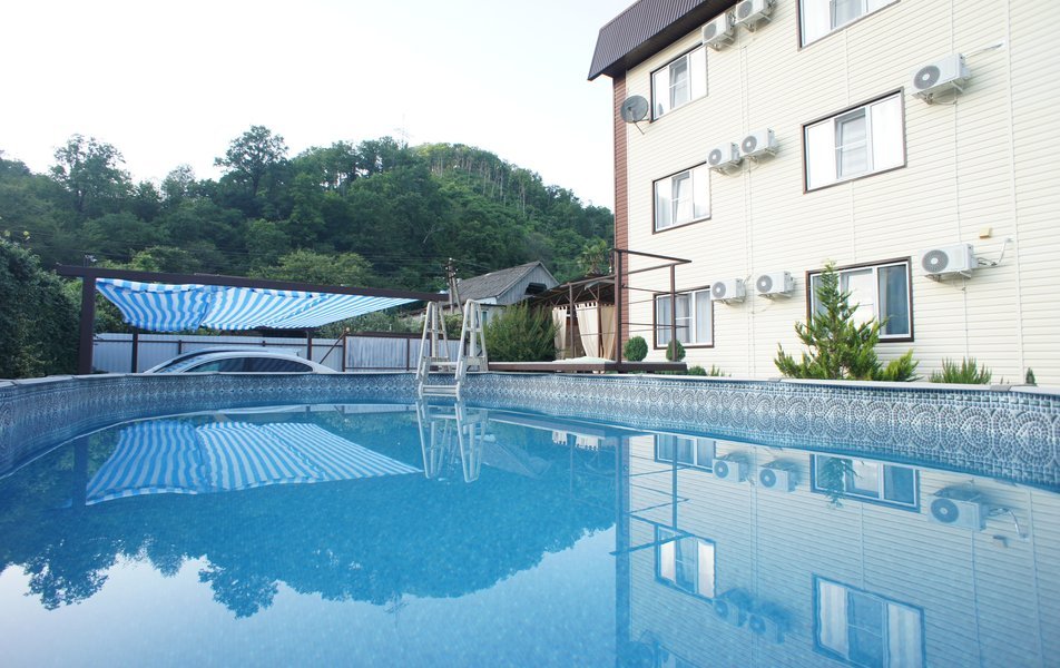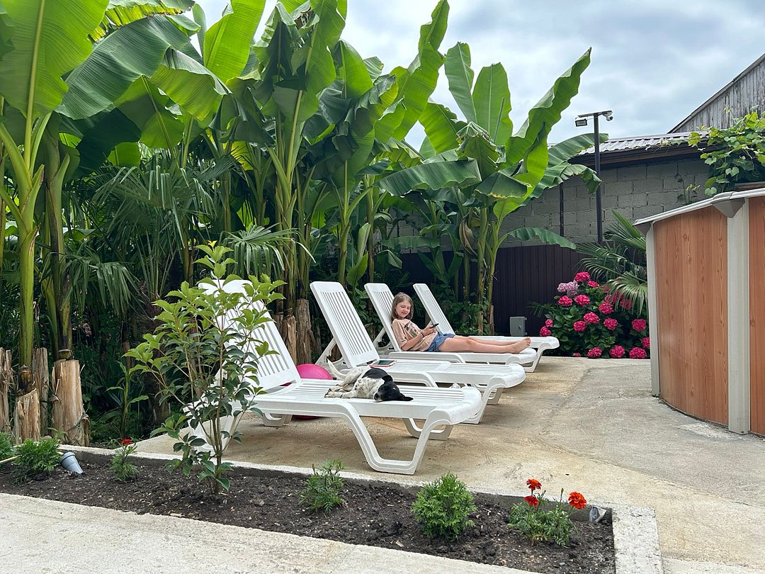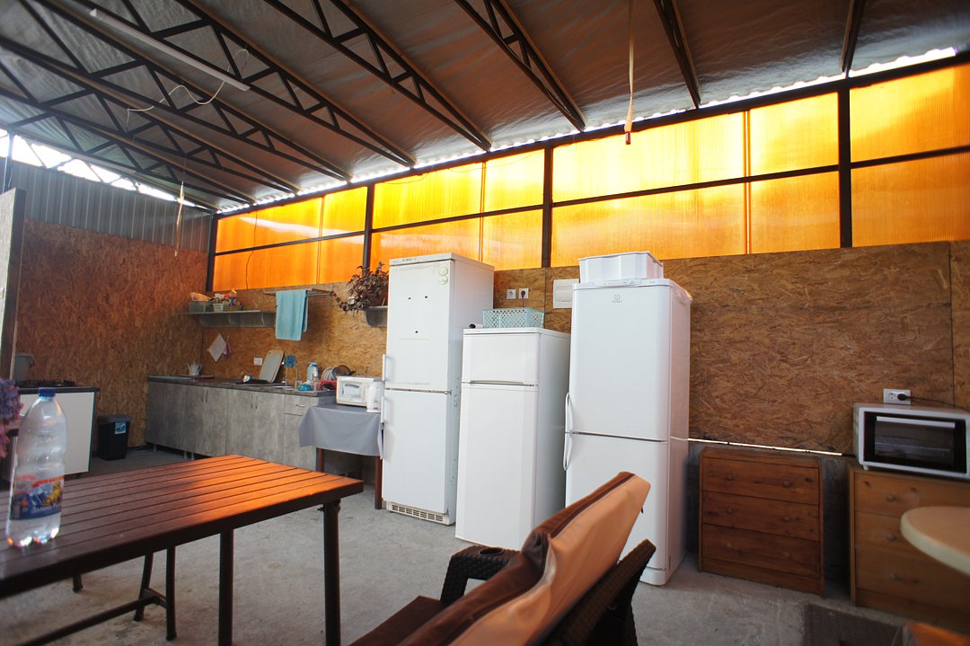 На территории гостевого дома оборудованы: полностью оборудованная кухня-беседка общего пользования, беседка с мангалом, парковка во дворе и рядом с домом, открытый бассейн, шезлонги, интернет Wi-Fi, детская площадка, батут для детей.
