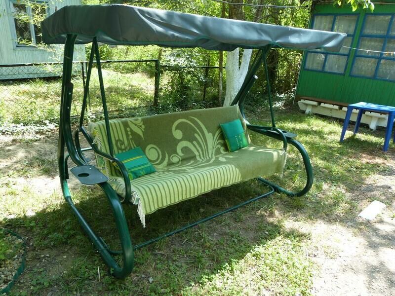 Удобные и мягкие лавочки-качели с навесом прекрасно подходят для отдыха в тени.