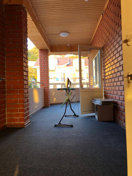 В общем пользовании сушилка, хороший утюг. В номере есть чайник и холодильник.