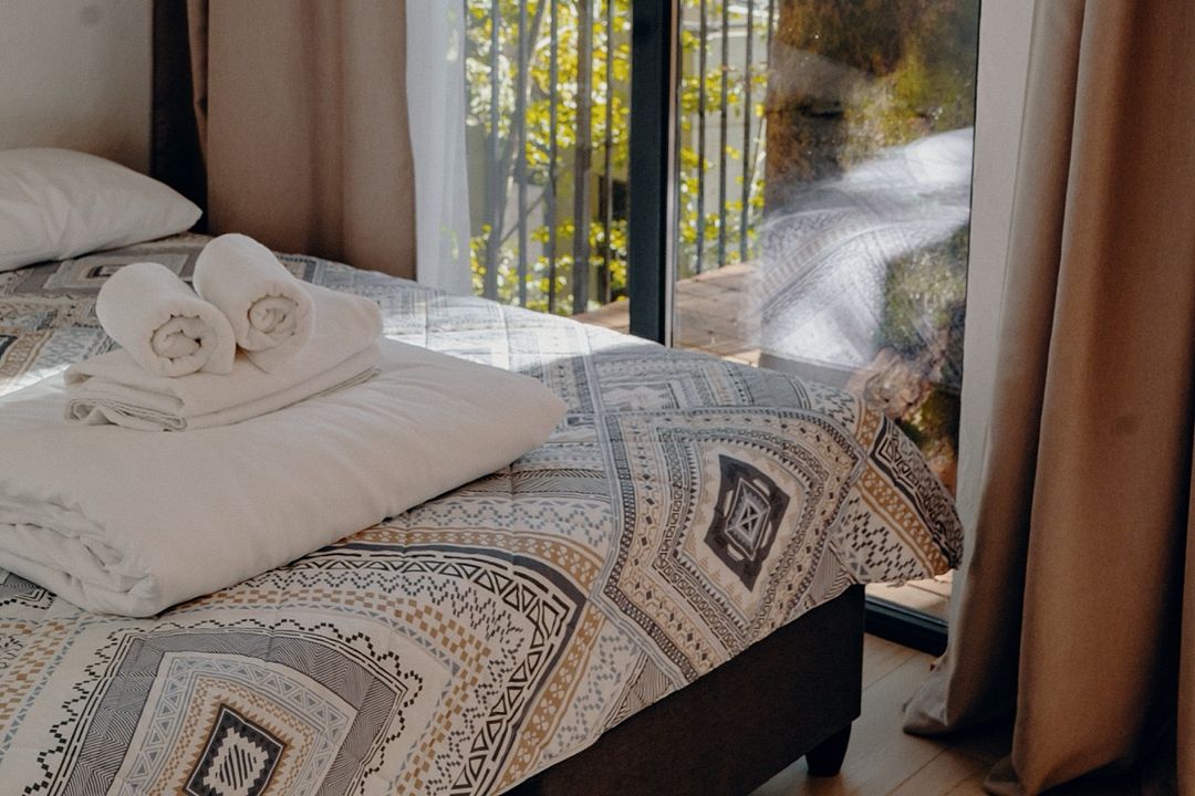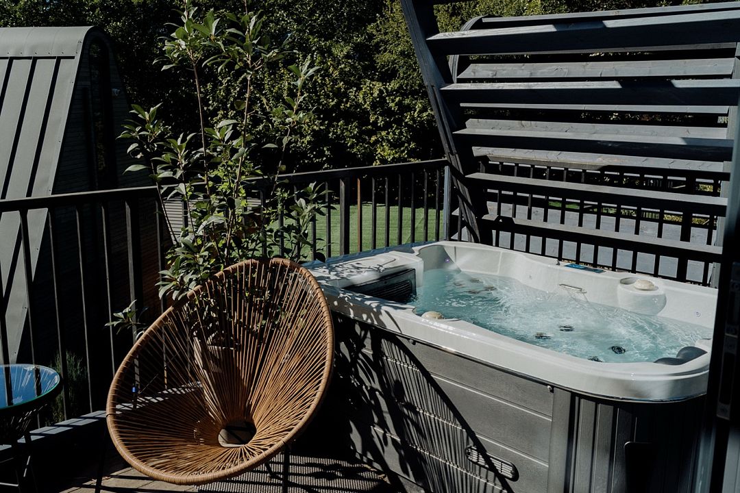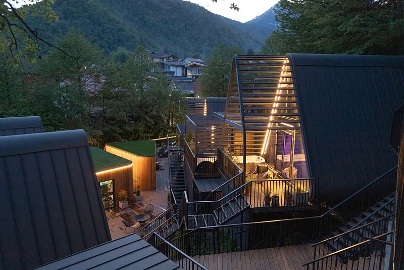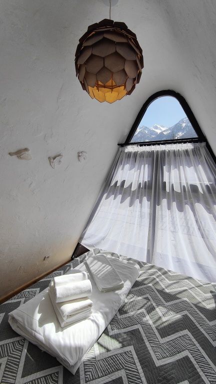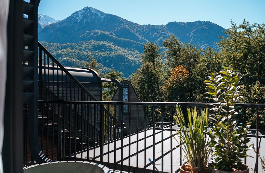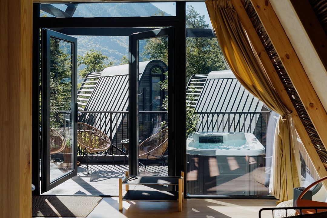 Из каждого варианта открывается потрясающий вид на горы, которым можно любоваться с индивидуальной террасы. Есть варианты с купелью и джакузи, включёнными в стоимость проживания.