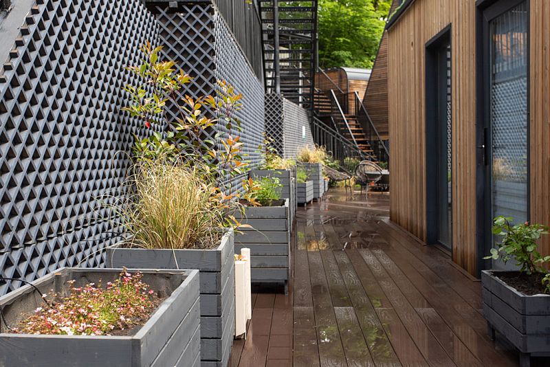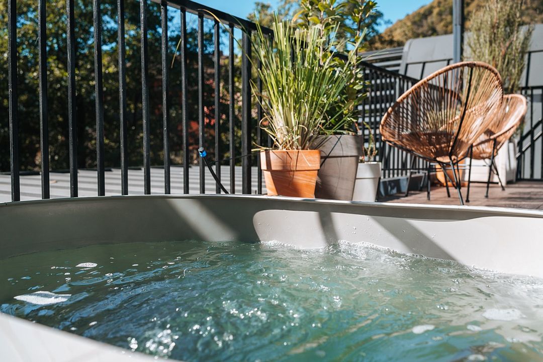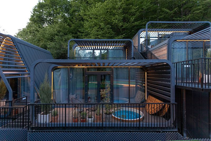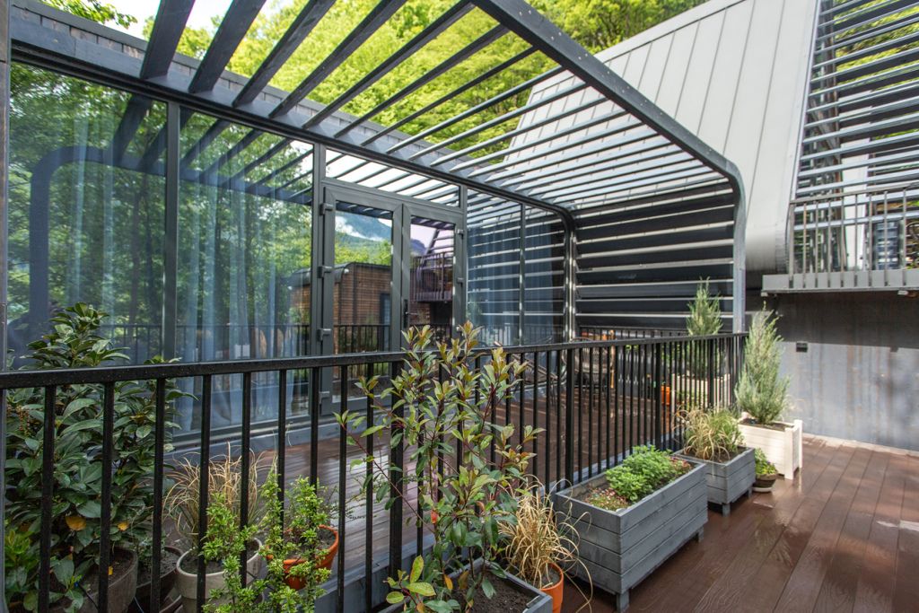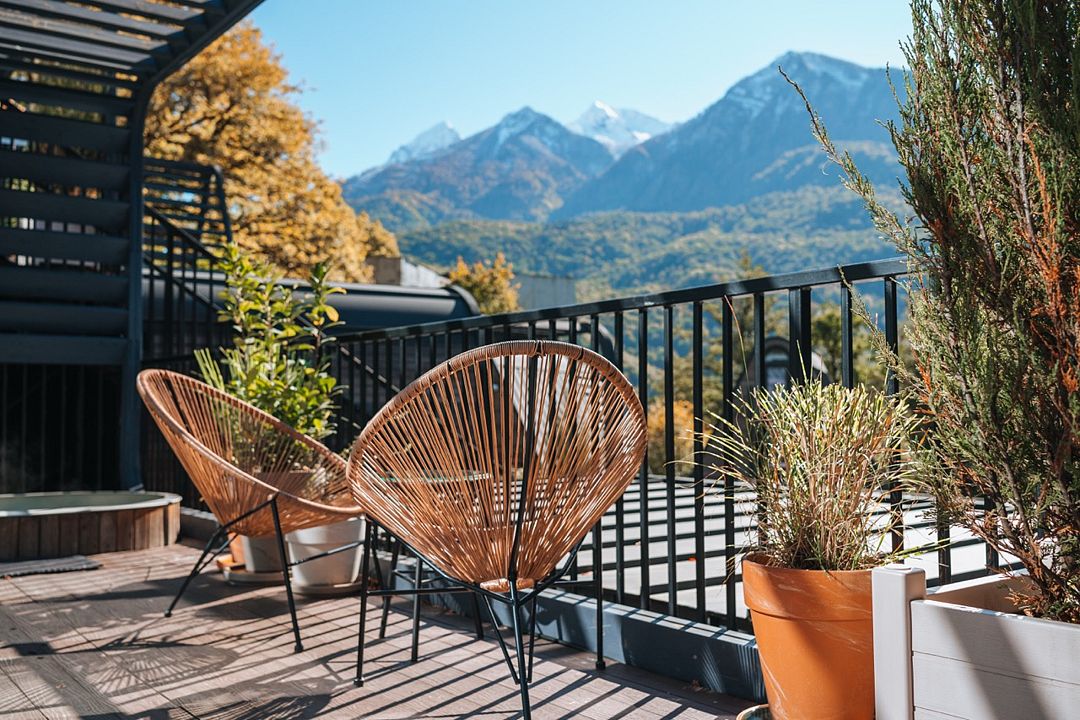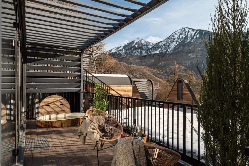 Все дома со своей просторной террасой, на которой вас ждет всесезонное джакузи, доступное вам в любой момент пребывания, и кресла, откуда открывается панорамный вид на горные вершины.