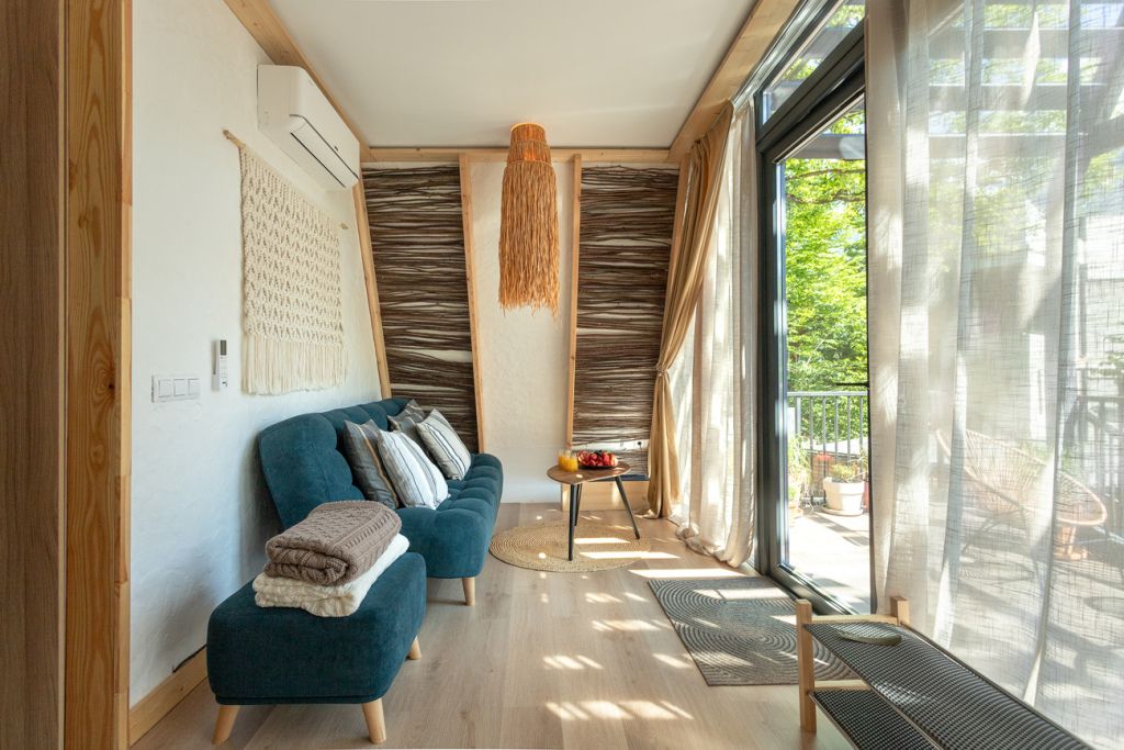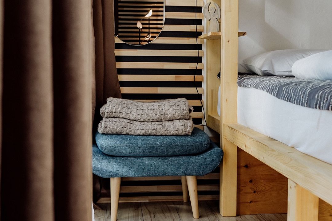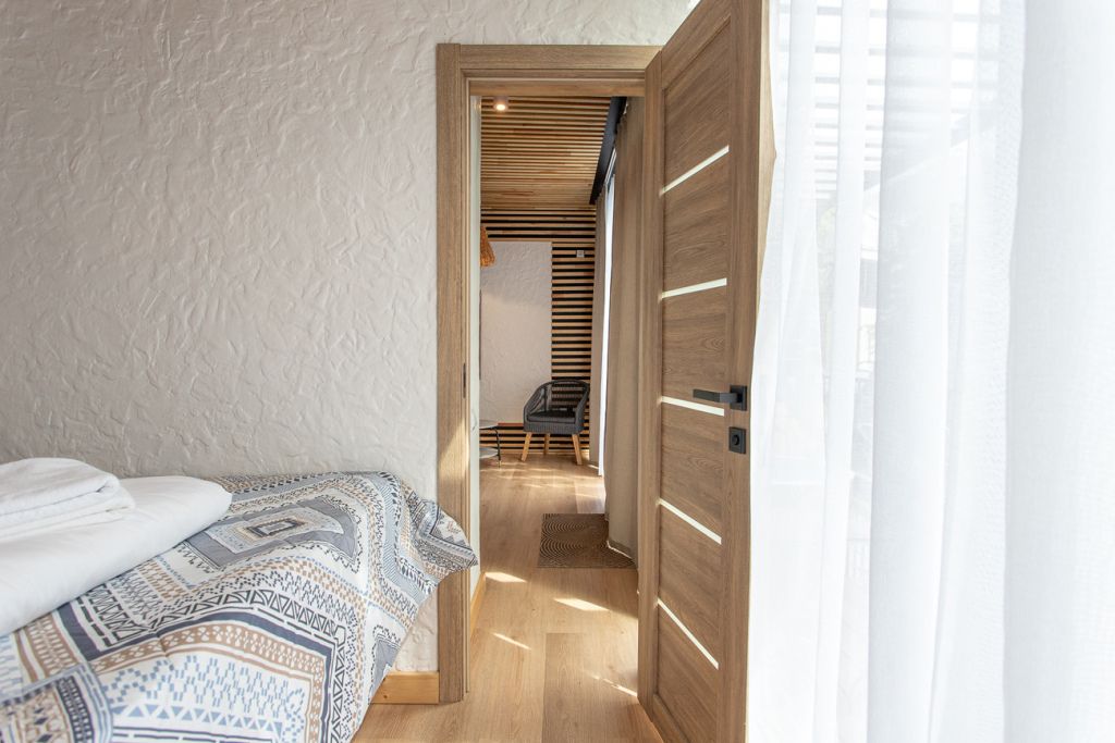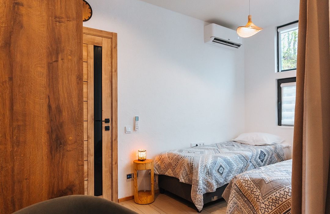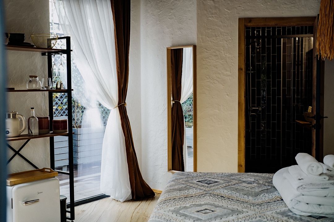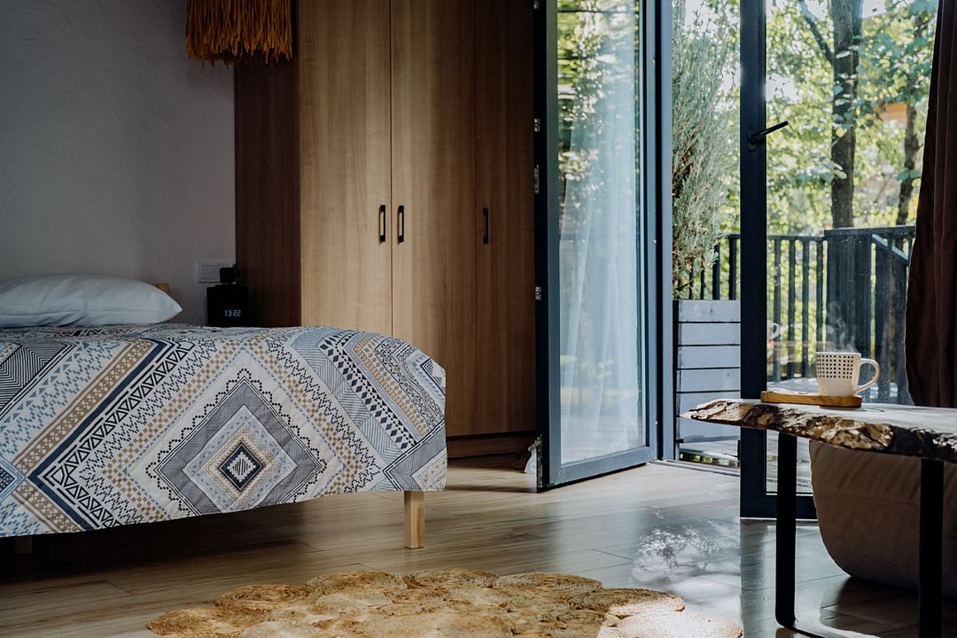 Единое пространство, объединяющее спальную зону и лаунж, в сочетании с доступным расположением на территории эко-отеля и отсутствием ступеней, делают Горный дом особенном комфортным для гостей с меленькими детьми или для гостей с ограниченной подвижностью.