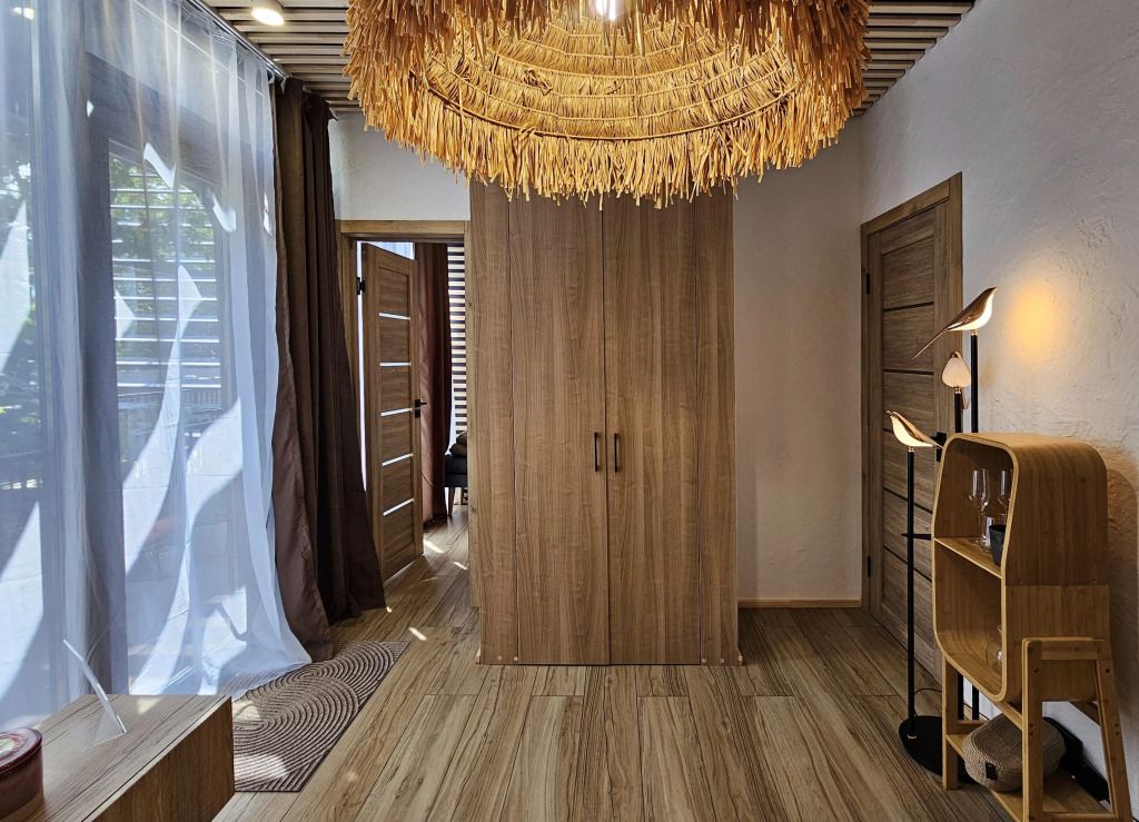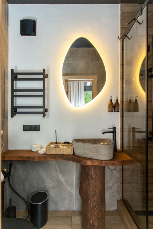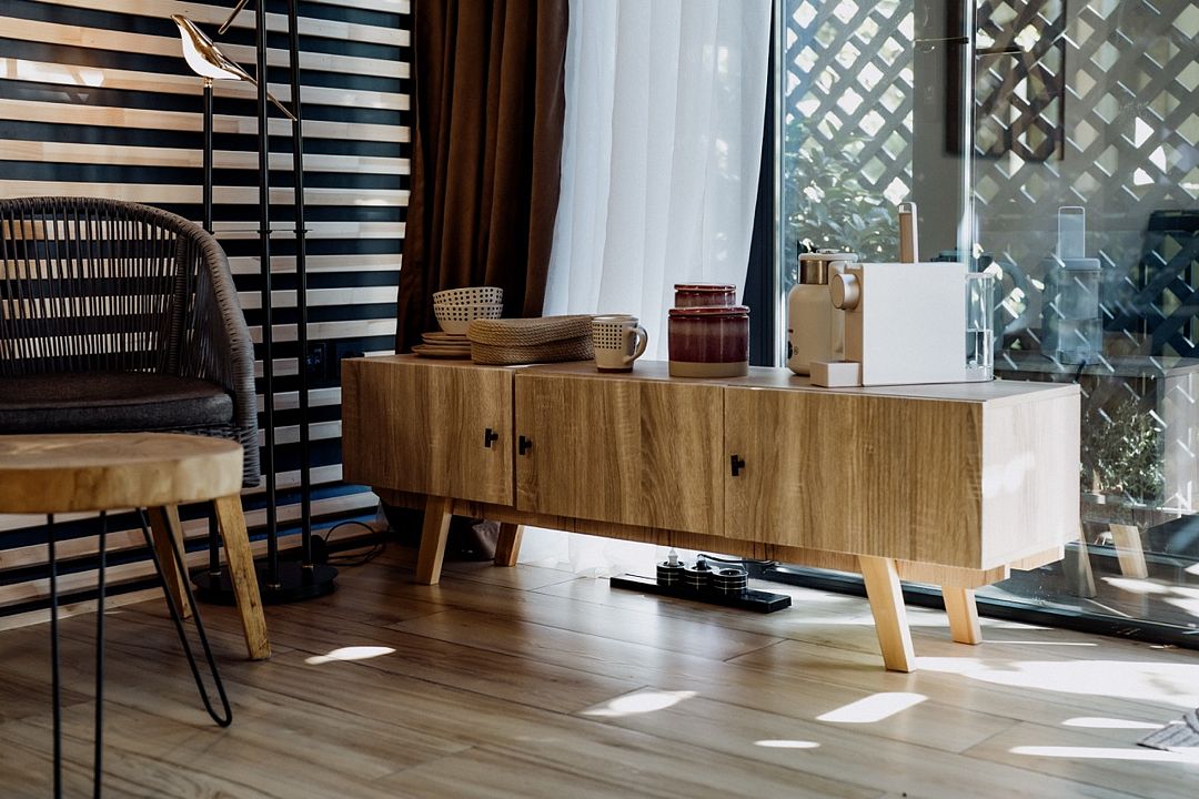 Дизайнерский интерьер бунгало выдержан в единой концепции и создает атмосферу стиля, делая ваш отдых в Красной Поляне не только приятным, но и изысканным.