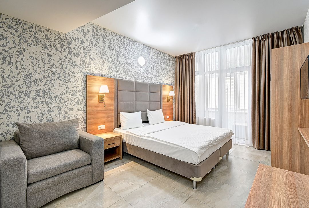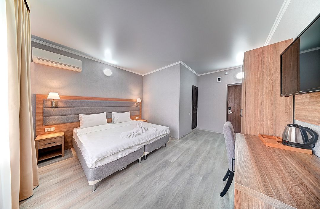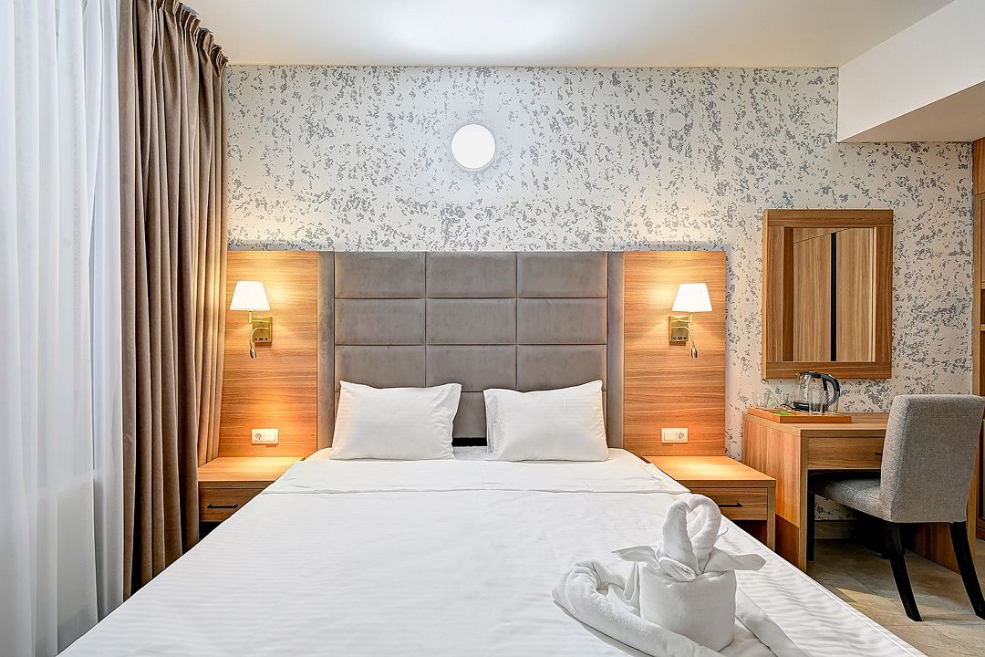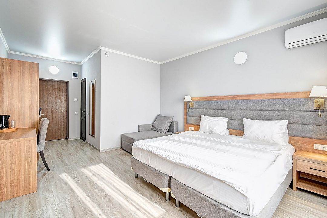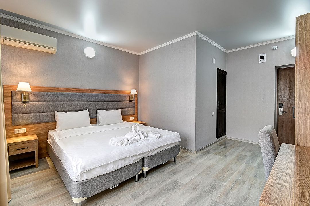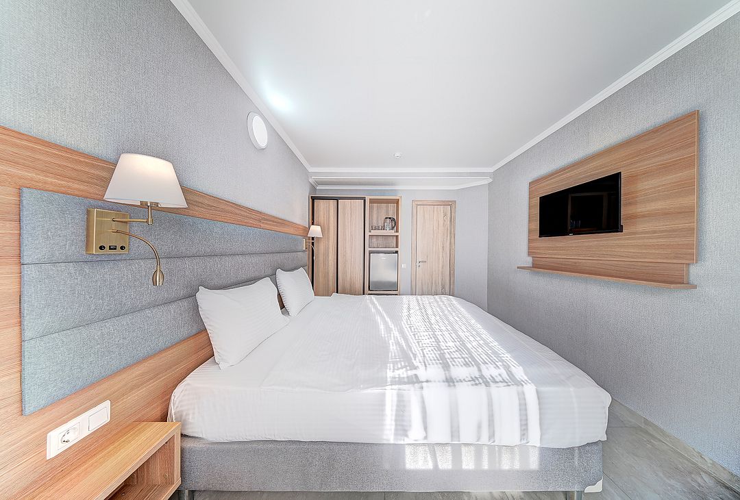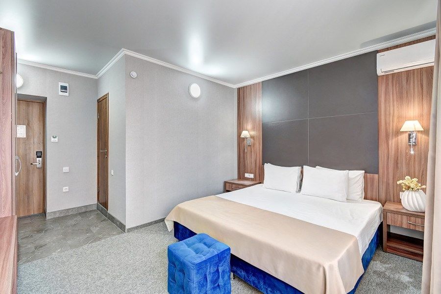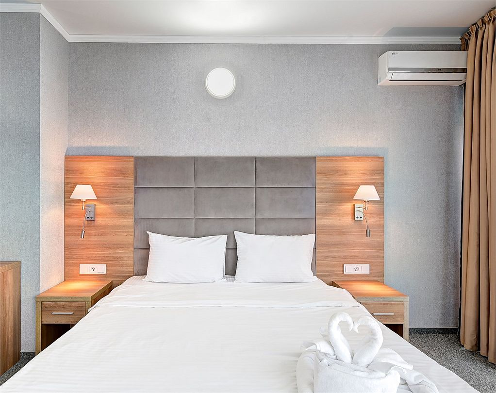 Номер оснащён удобной двуспальной кроватью с ортопедическим матрасом, прикроватными тумбочками с индивидуальным освещением, пуфом, который используется как дополнительное место, столиком, электронным сейфом и системой автоматического кондиционирования.
