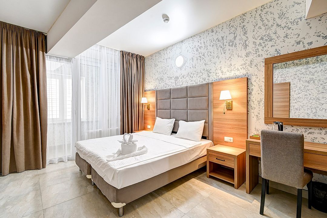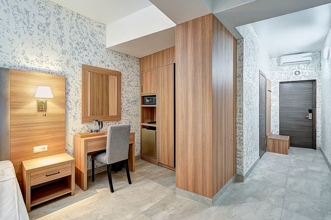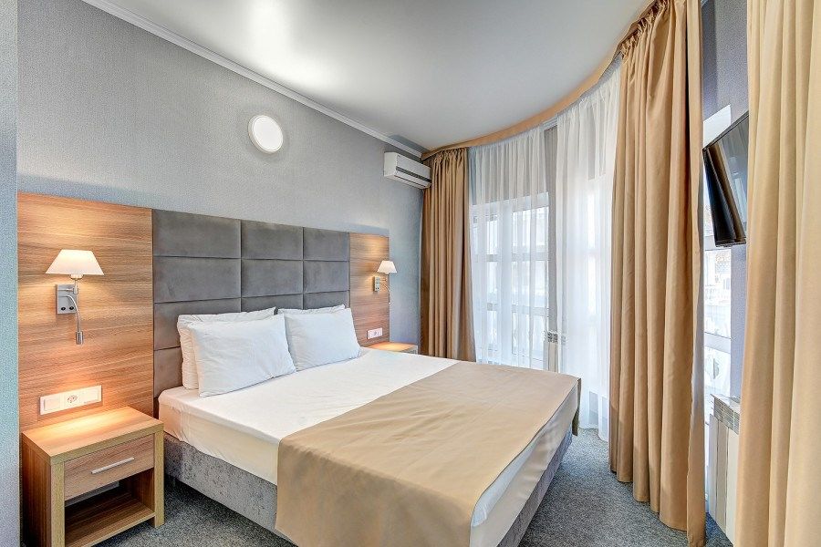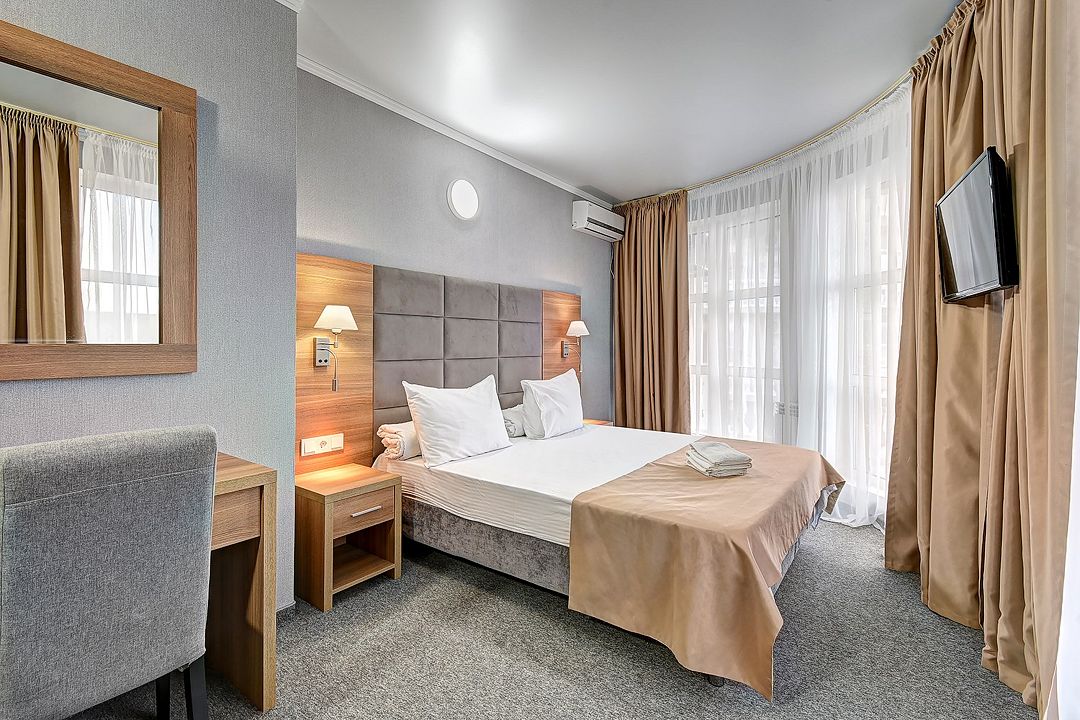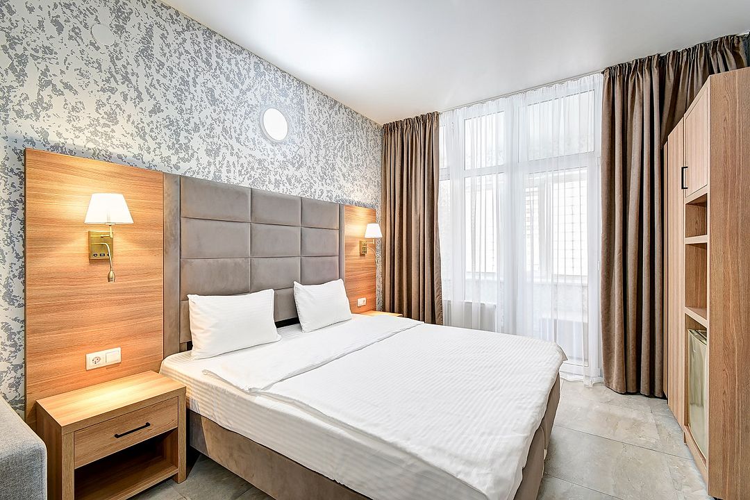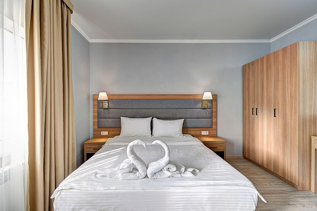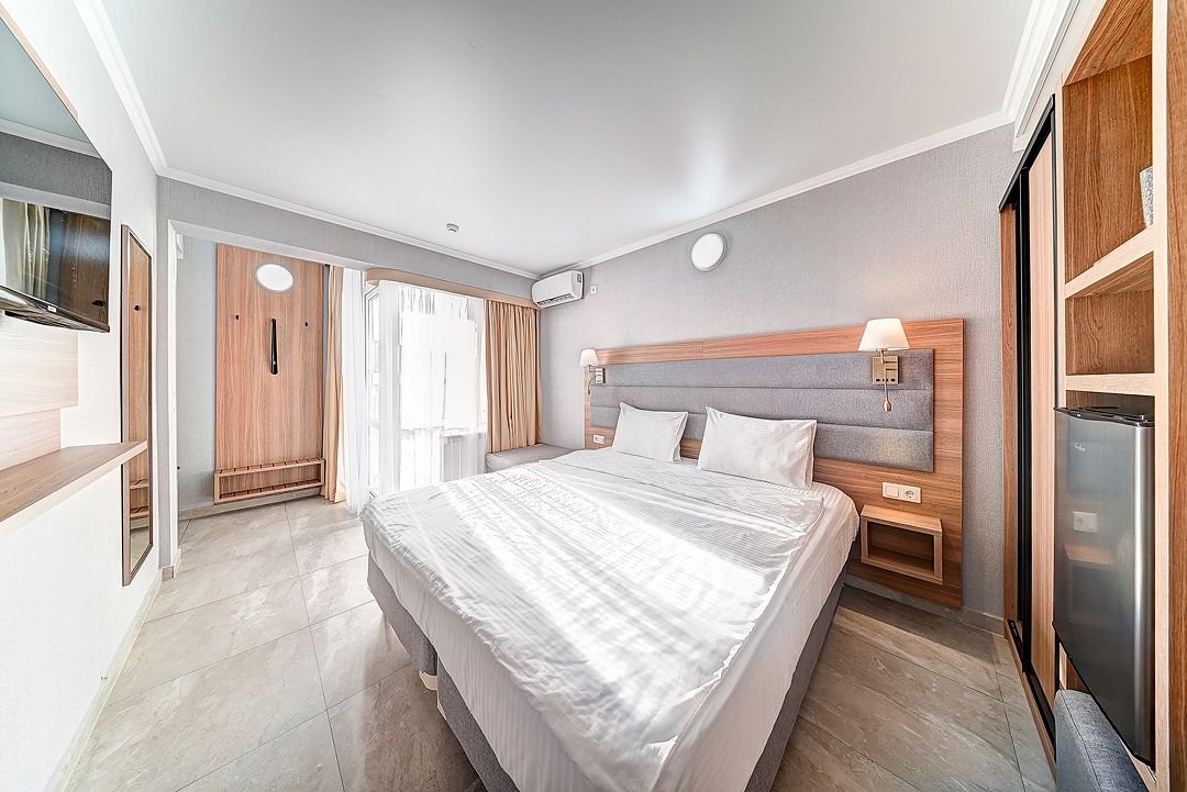 Номер оснащён удобной двуспальной кроватью с ортопедическим матрасом, прикроватными тумбочками с индивидуальным освещением, пуфом, который используется как дополнительное место, столиком, электронным сейфом и системой автоматического кондиционирования.
