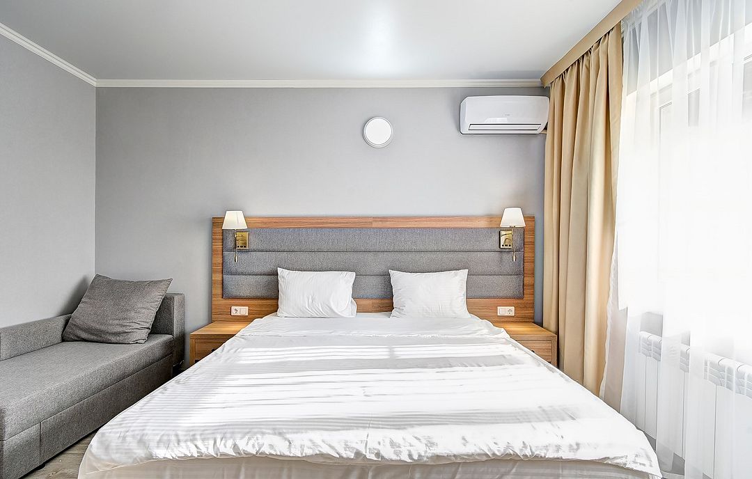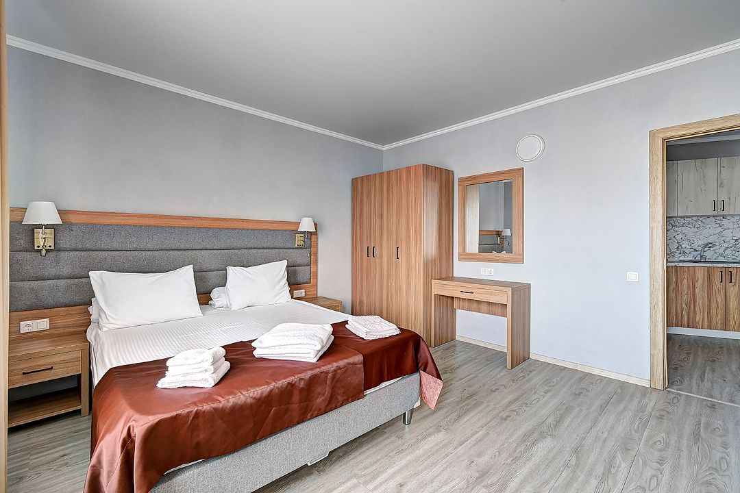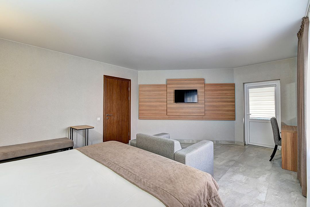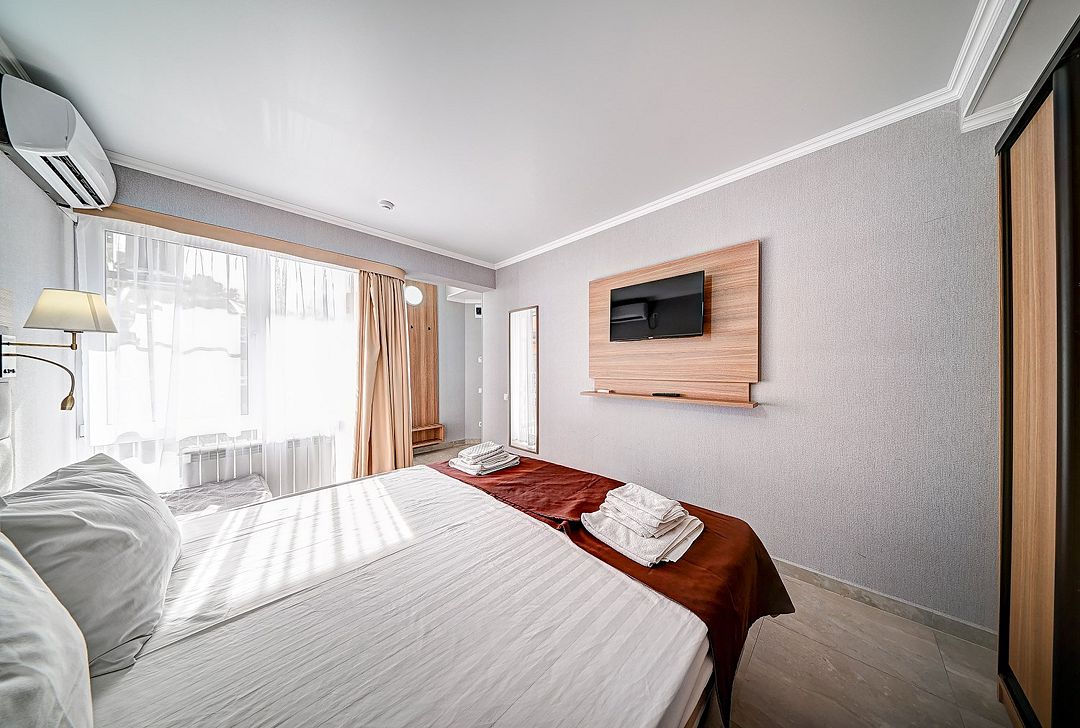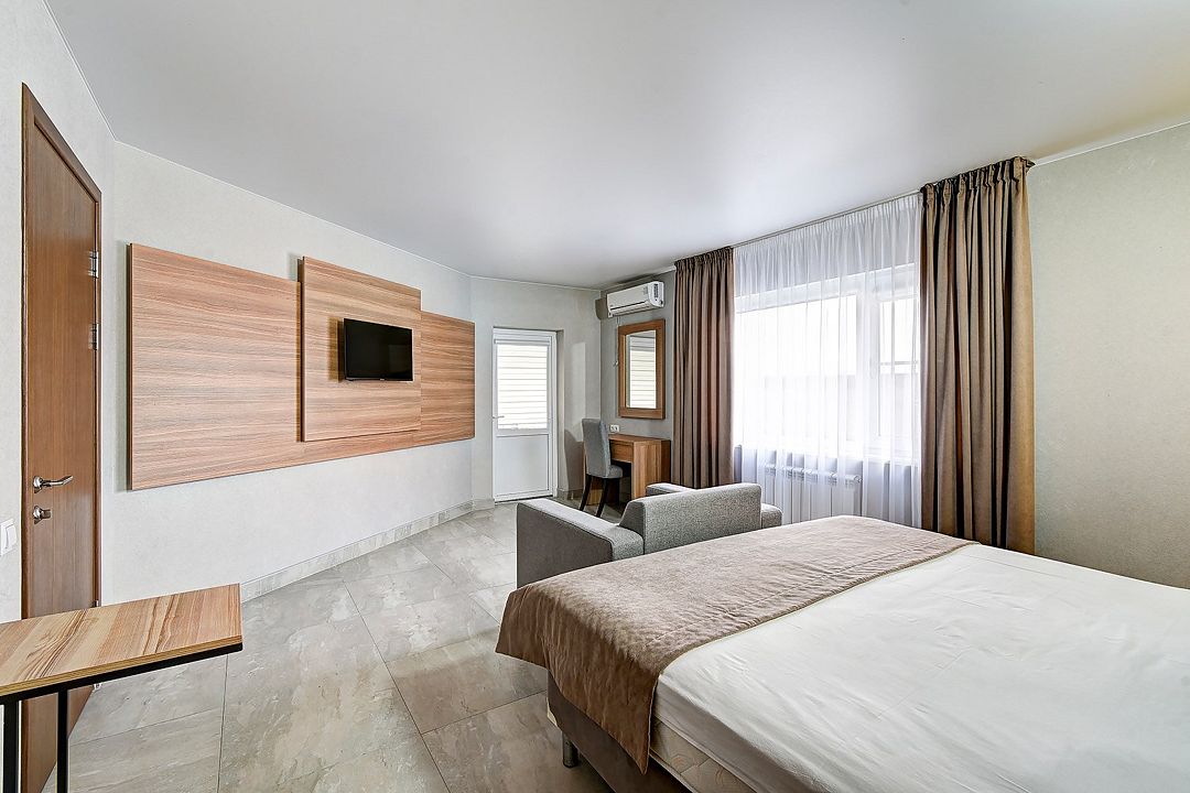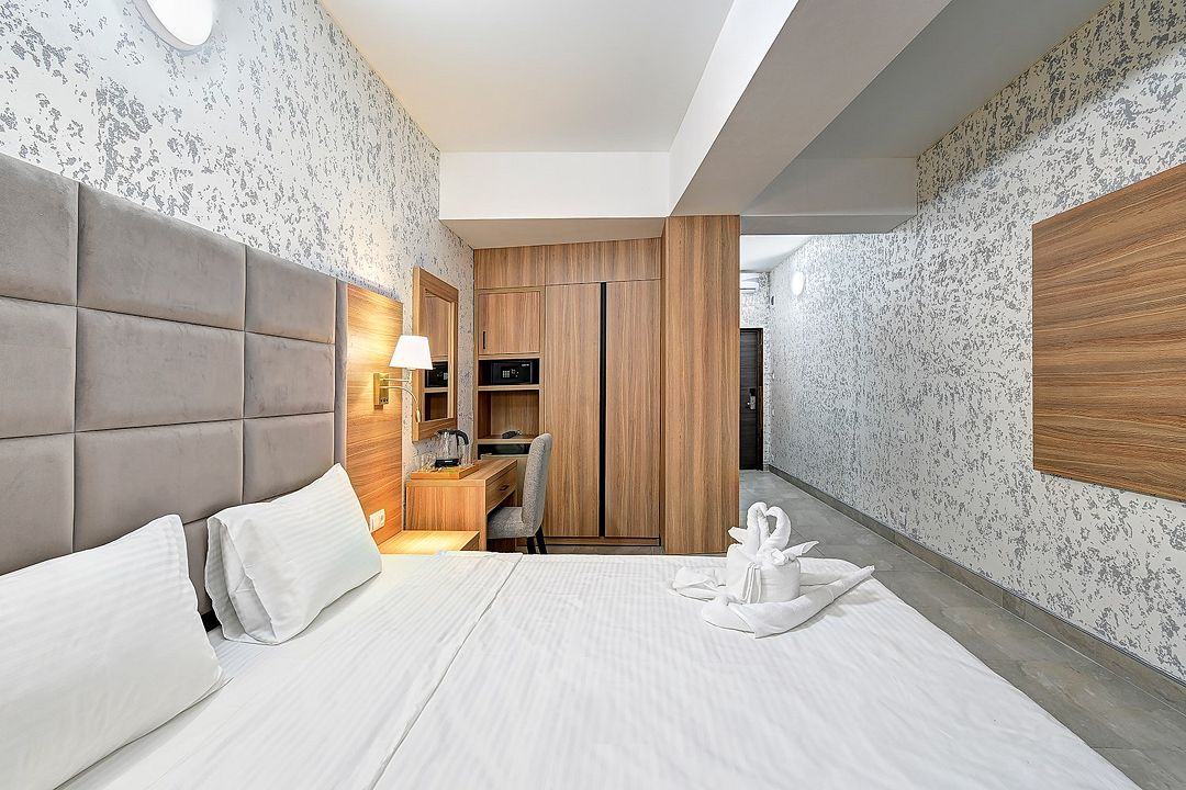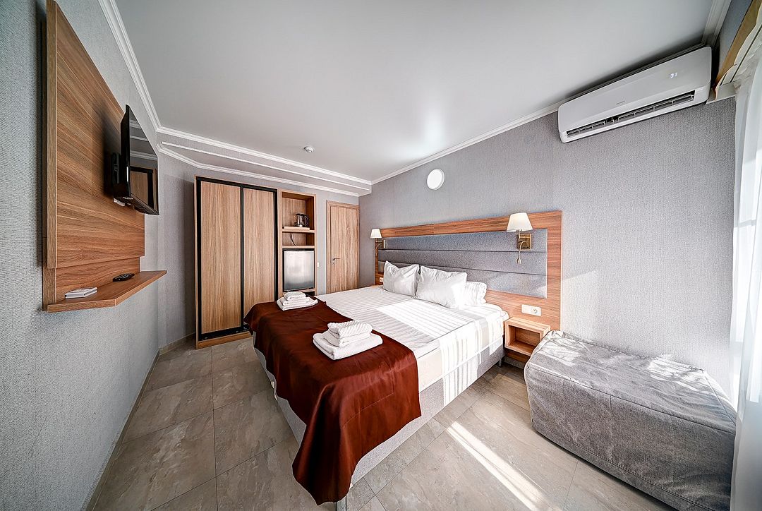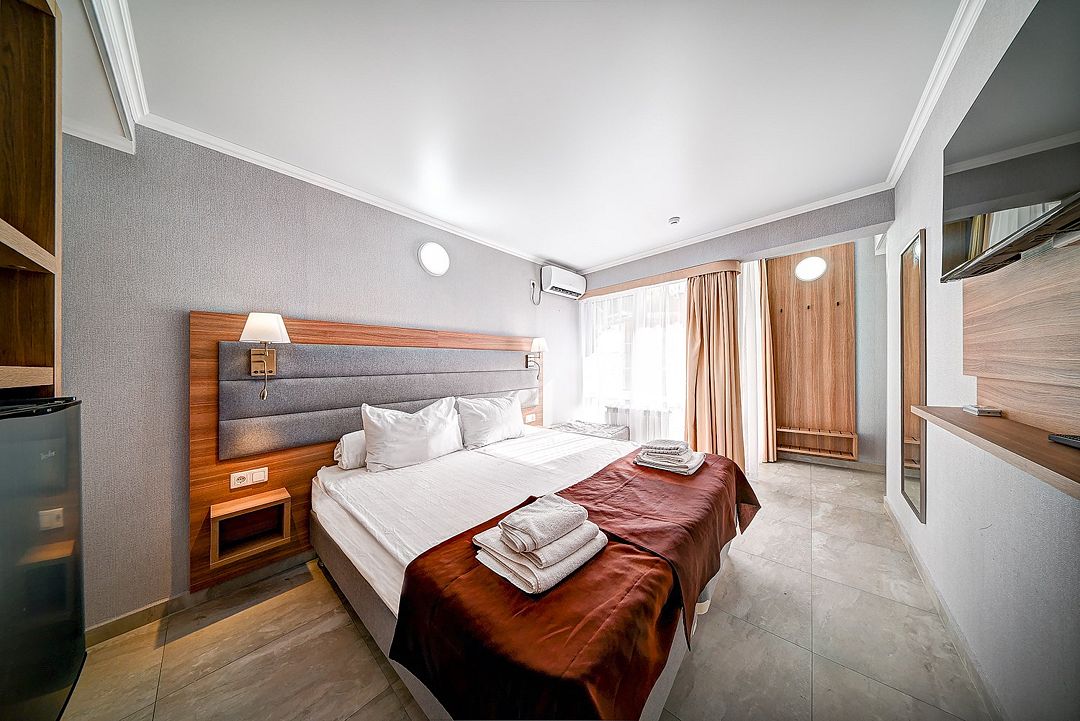 Номер оснащён удобной двуспальной кроватью с ортопедическим матрасом, прикроватными тумбочками с индивидуальным освещением, пуфом, который используется как дополнительное место, столиком, электронным сейфом и системой автоматического кондиционирования.