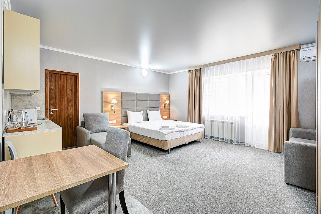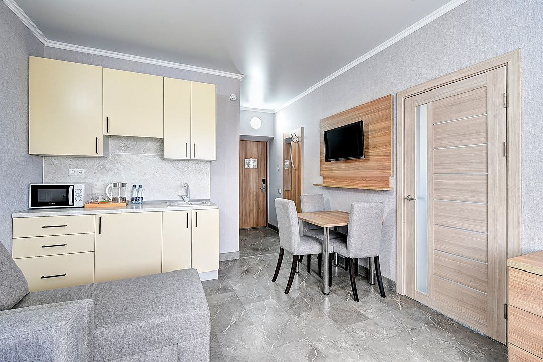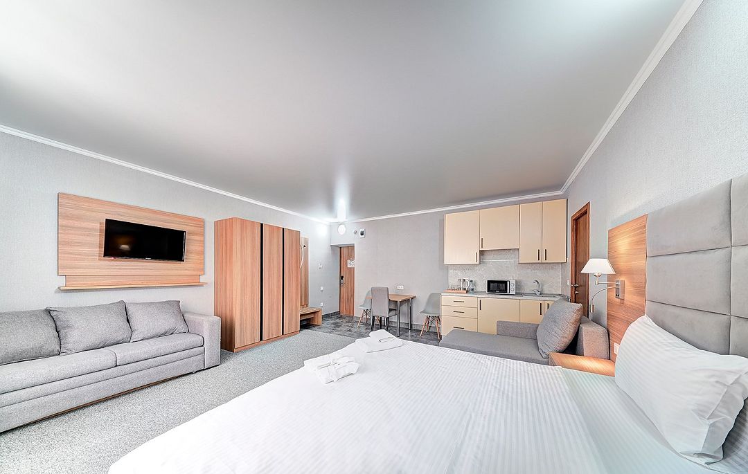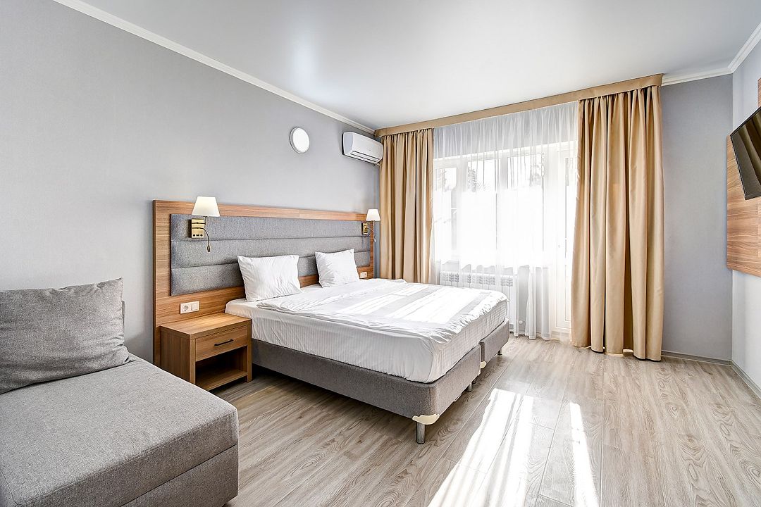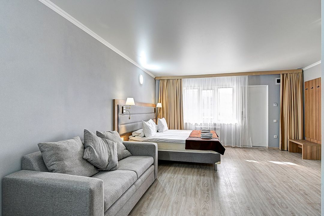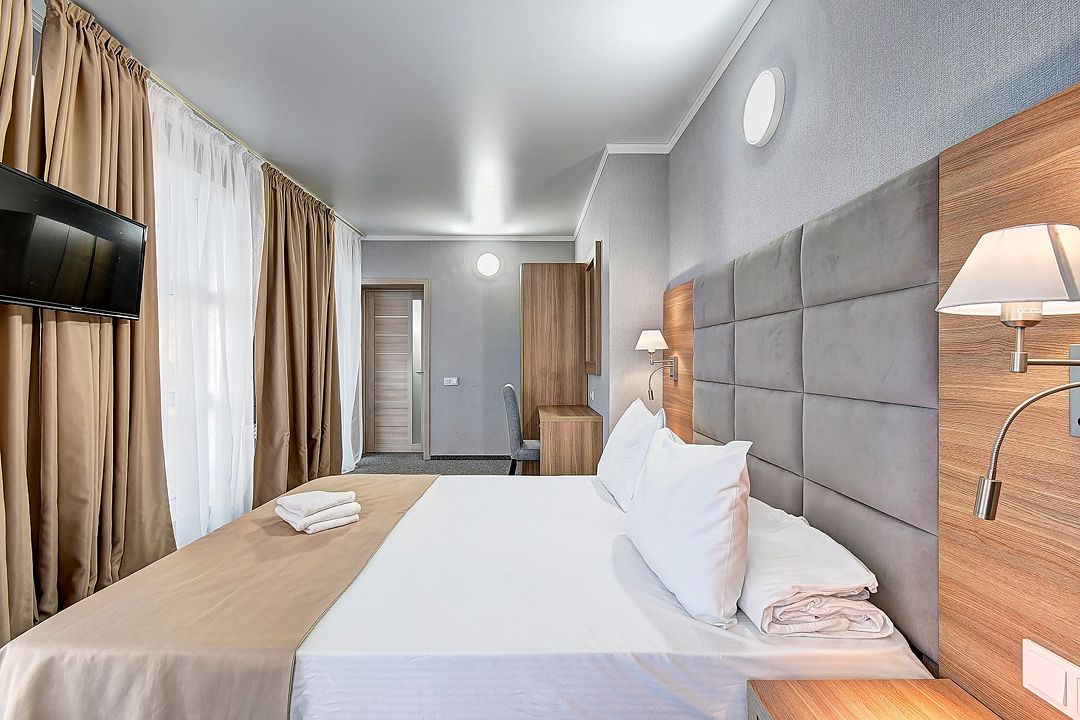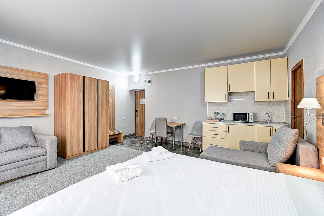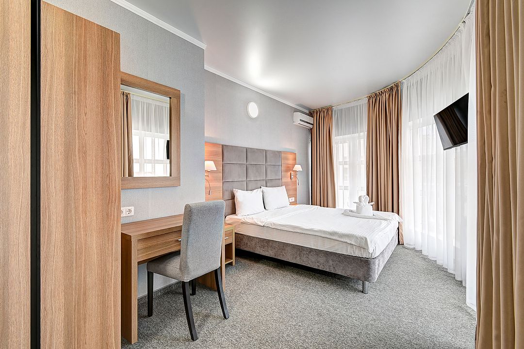 Стандартный однокомнатный номер площадью 18-19 м² оформлен в современном стиле, интерьер выполнен в светлых тонах.