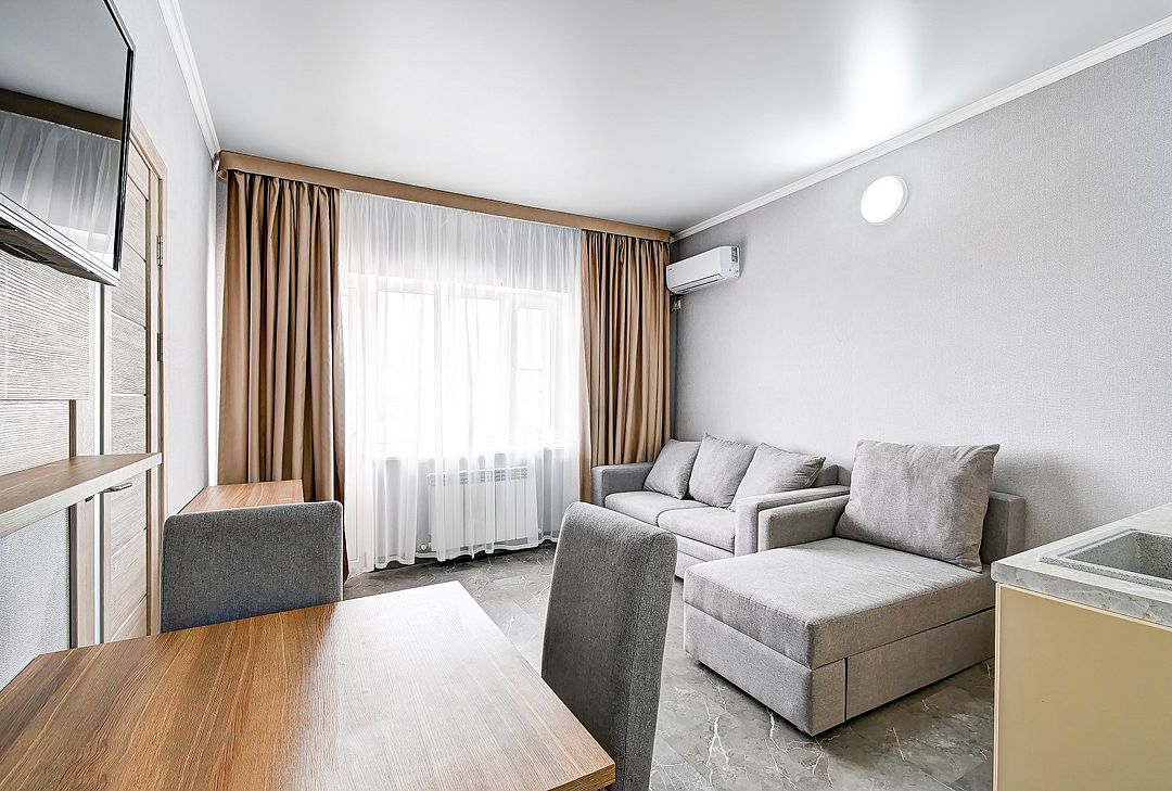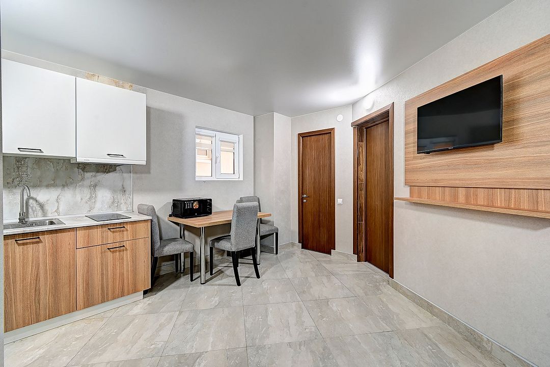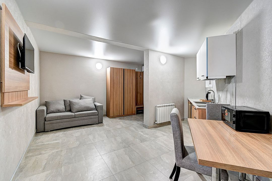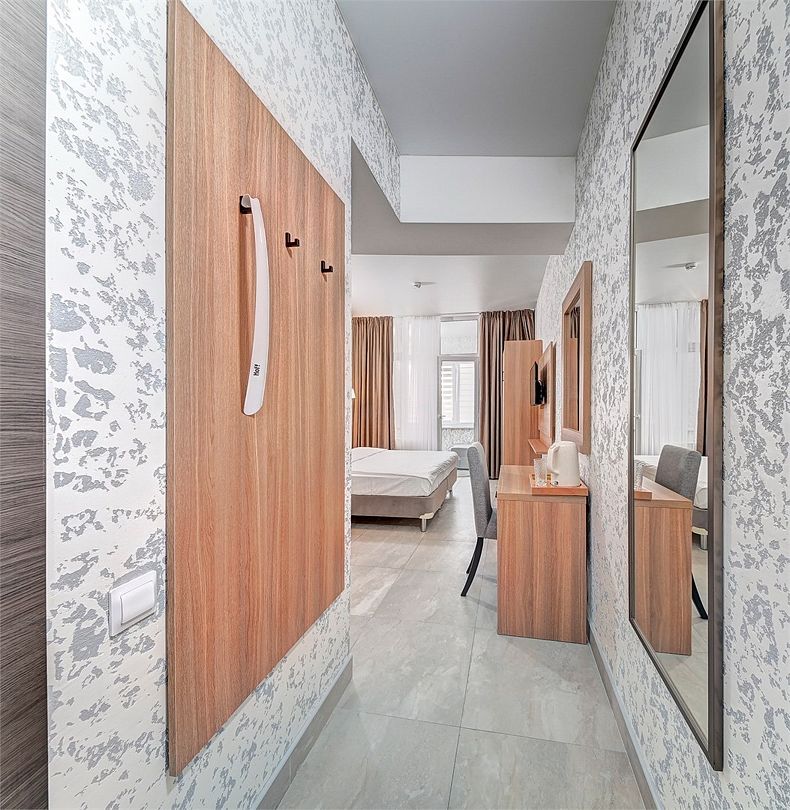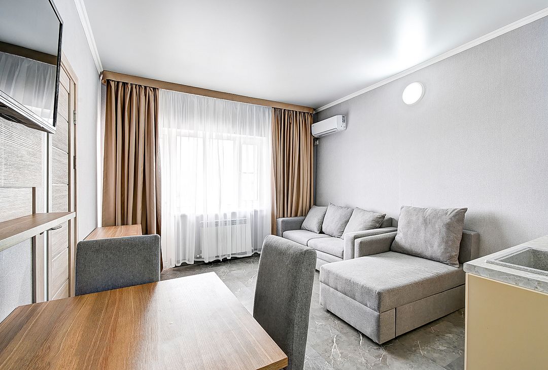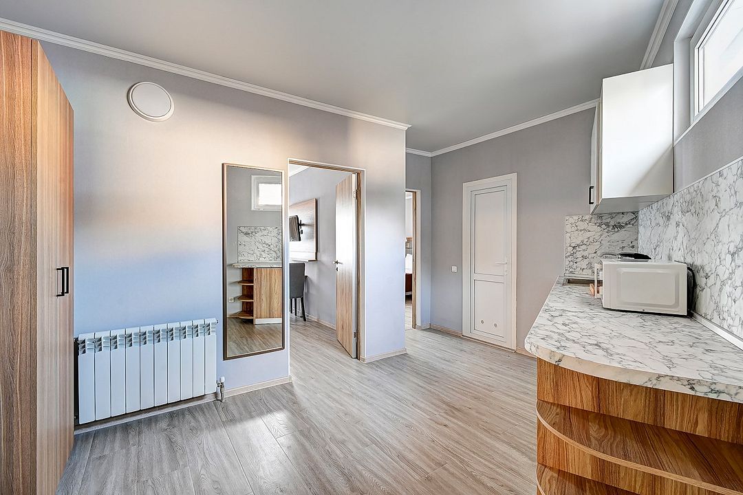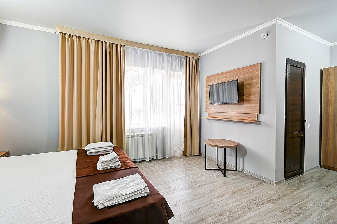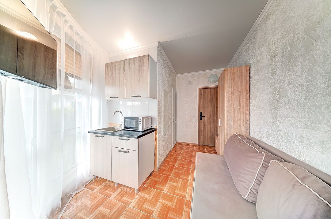 Стандартный однокомнатный номер площадью 18-19 м² оформлен в современном стиле, интерьер выполнен в светлых тонах.