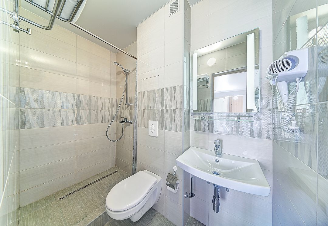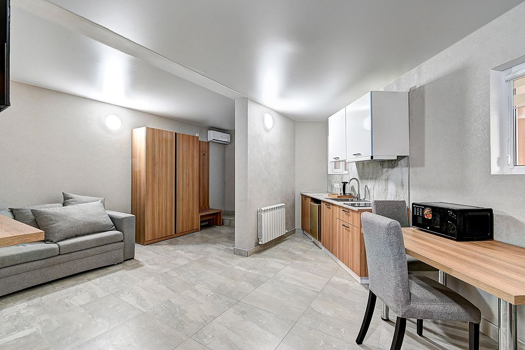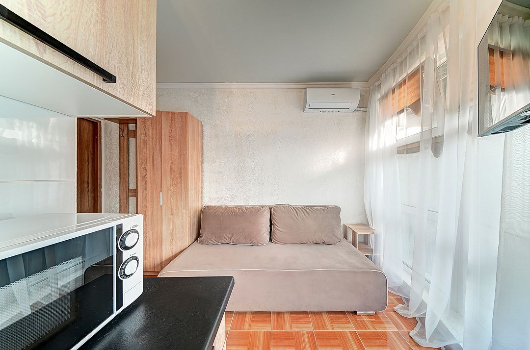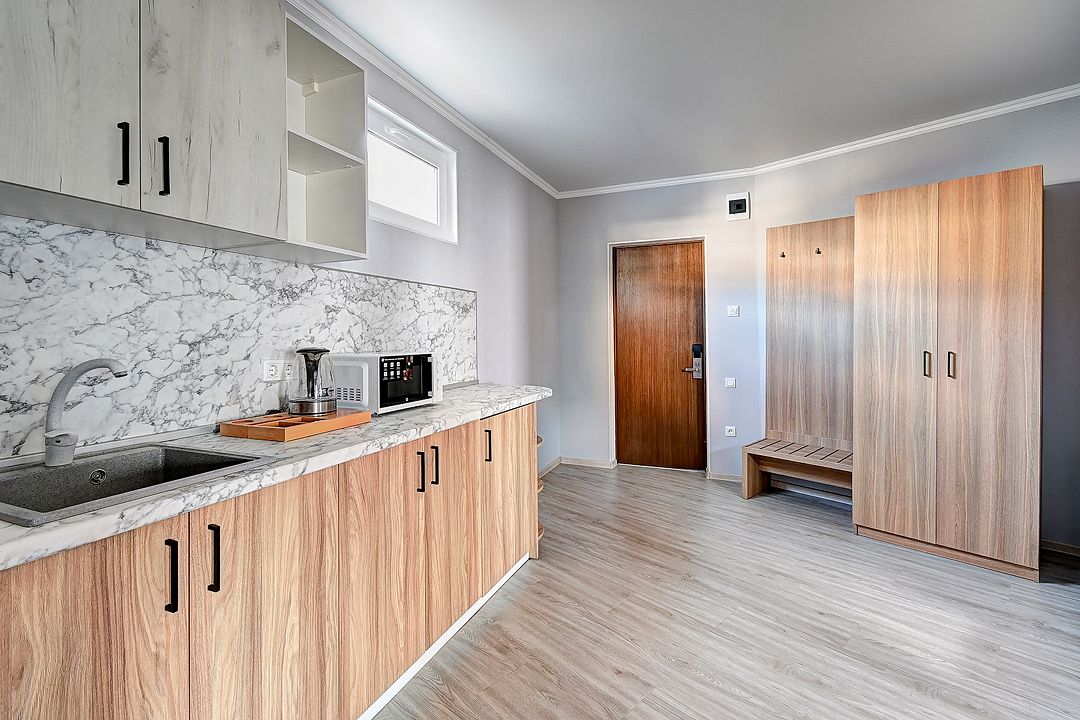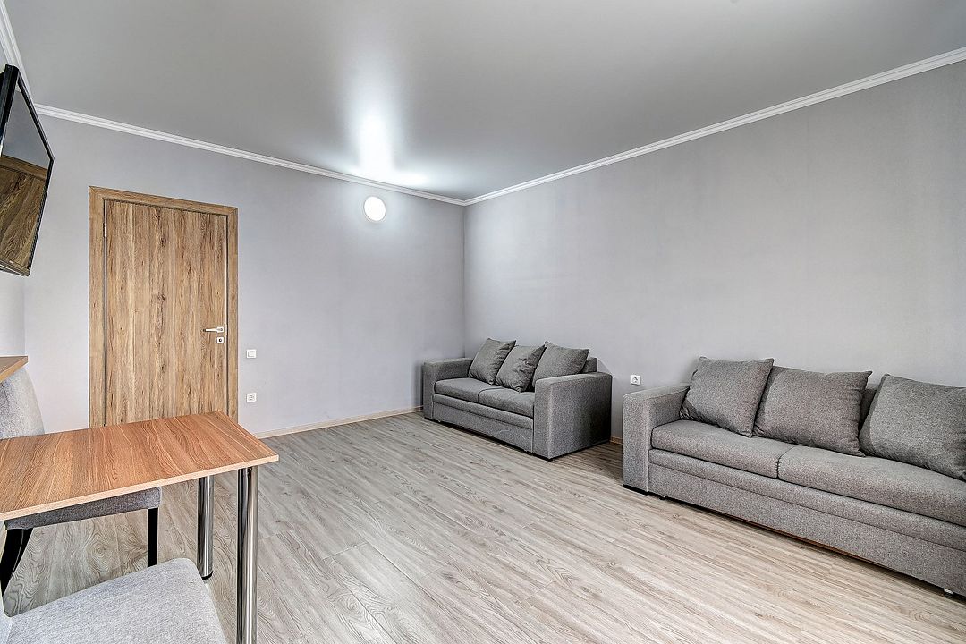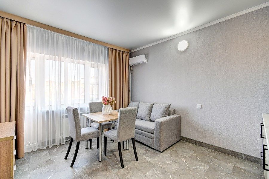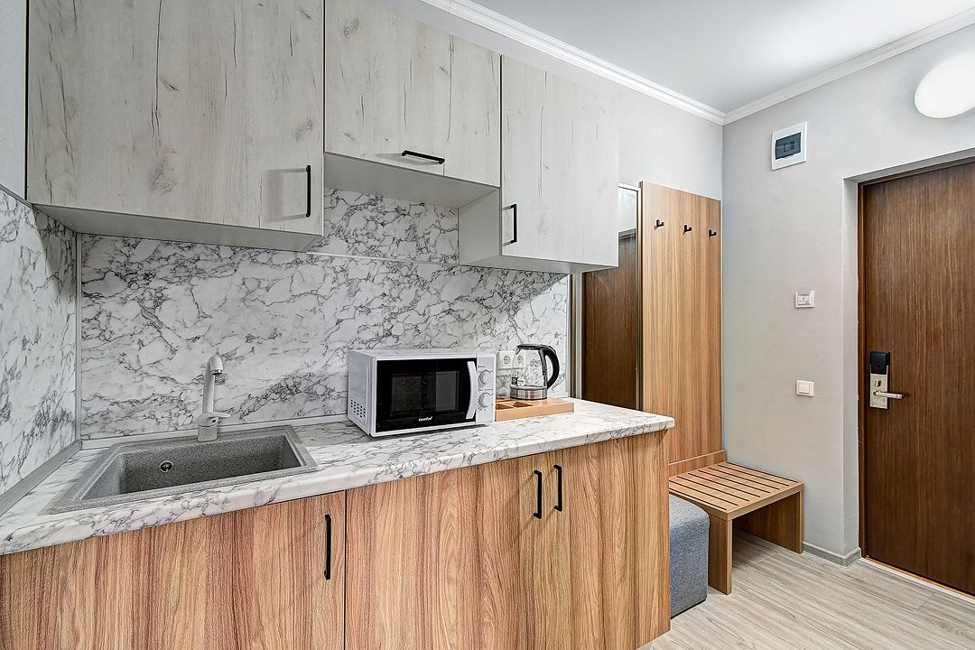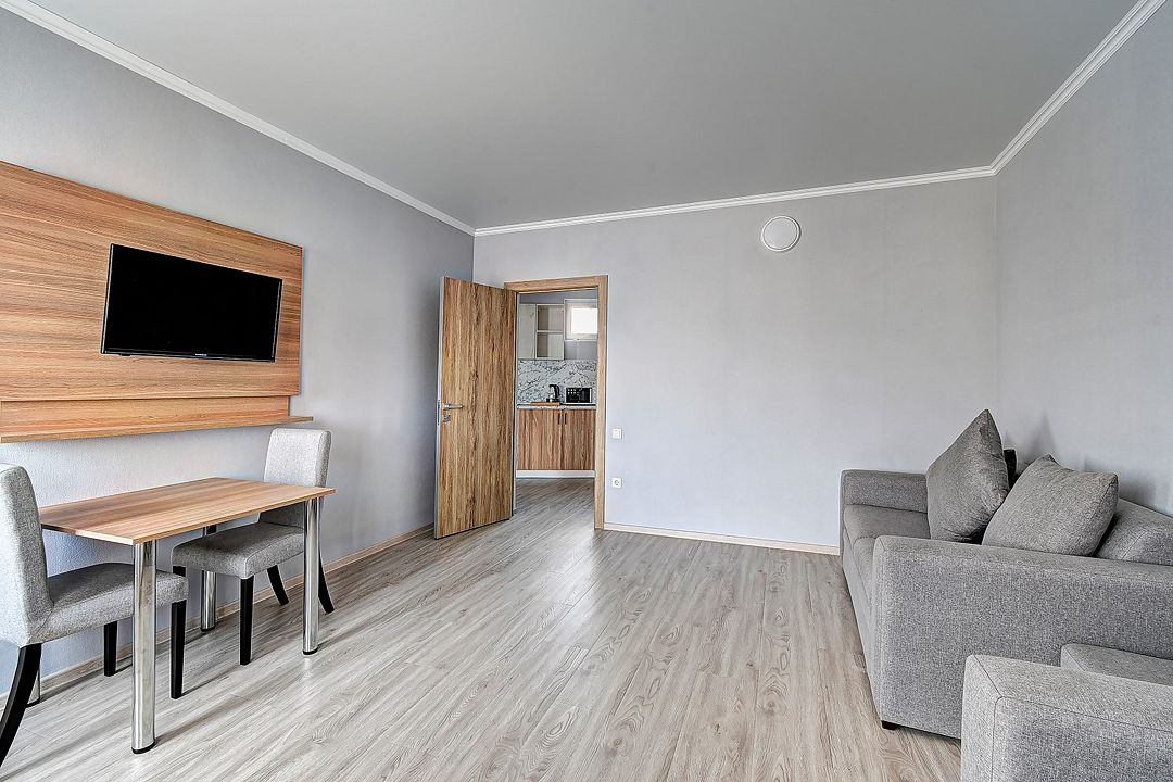 Стандартный однокомнатный номер площадью 18-19 м² оформлен в современном стиле, интерьер выполнен в светлых тонах.
