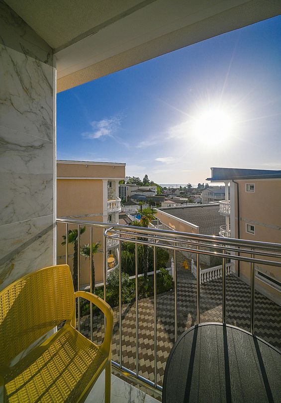 В распоряжении гостей ванная комната с душевой кабиной, феном и косметическими принадлежностями, а также балкон с видом на море и горы, оборудованный столиком и стульями.