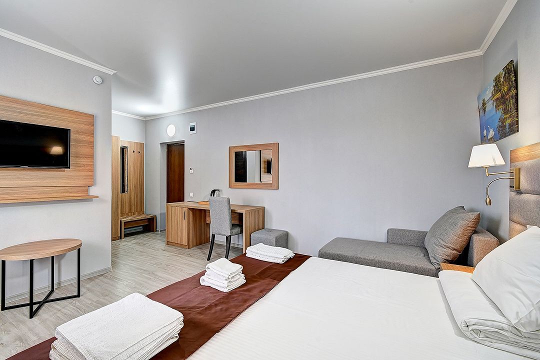 Четырехместный семейный номер площадью 30 кв.м с двуспальной кроватью с мягким изголовьем и двуспальным диваном или двумя односпальными, прикроватными тумбочками с индивидуальным освещением.