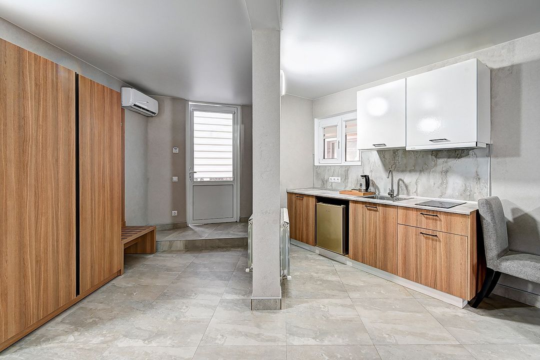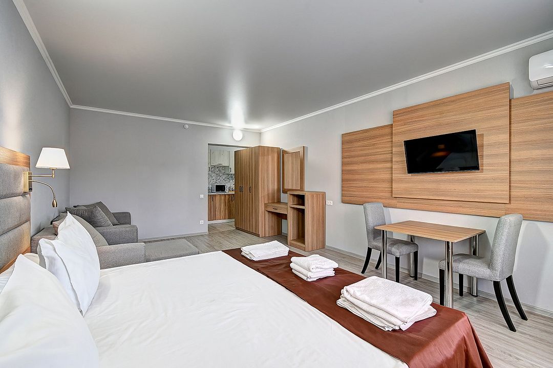 Номер оснащён раскладным диваном, столиком, мини-кухней, шкафом для одежды, беспроводным интернетом WI-FI, холодильником, телевизором с плоским экраном и Smart TV и системой автоматического кондиционирования.