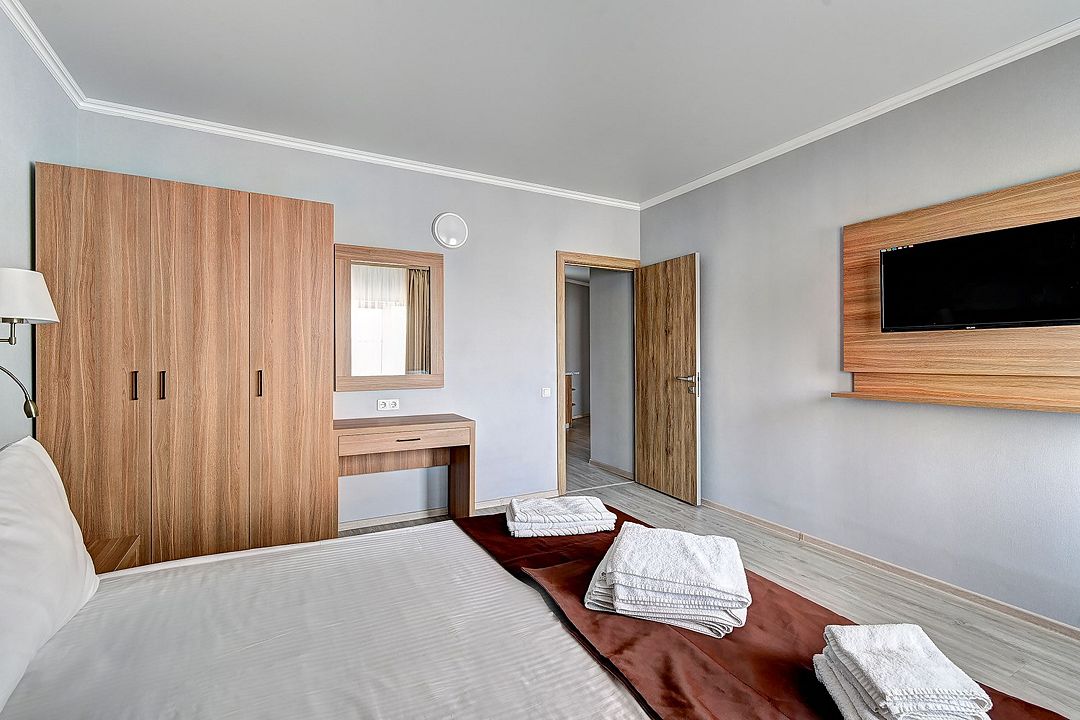 Для вашего удобства предусмотрен вместительный шкаф для одежды, а также рабочий стол с принадлежностями для приготовления кофе и чая, с беспроводным интернетом WI-FI. холодильником, телевизором с плоским экраном и Smart TV.