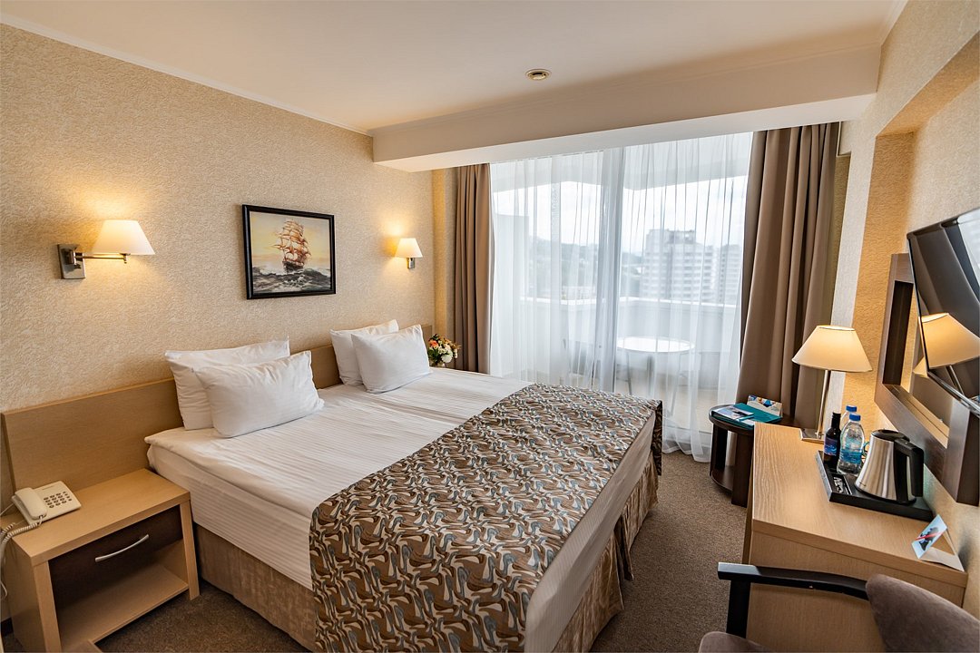 спутниковое телевидение, Wi-Fi, фен, радио, душевая кабина, санузел, банные полотенца, тапочки, гигиенические средства, косметические средства, балкон, две односпальные или большая двуспальная кровать, тумбы, стулья, шкаф для одежды, письменный стол, зеркало, сейф, раковина, ковровое покрытие, вид на море, вид на город, кулер на этаже, внутренний телефон, фанкойл, чайная станция, можно с питомцамиВ гостиничном номере