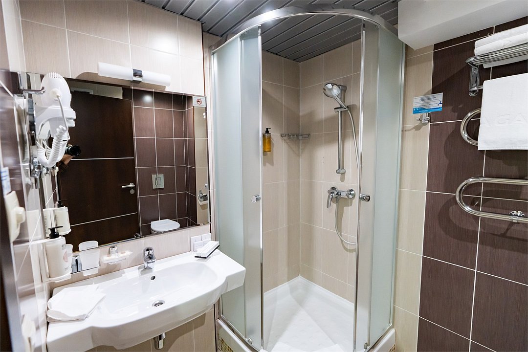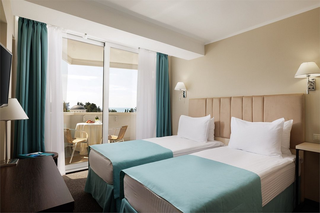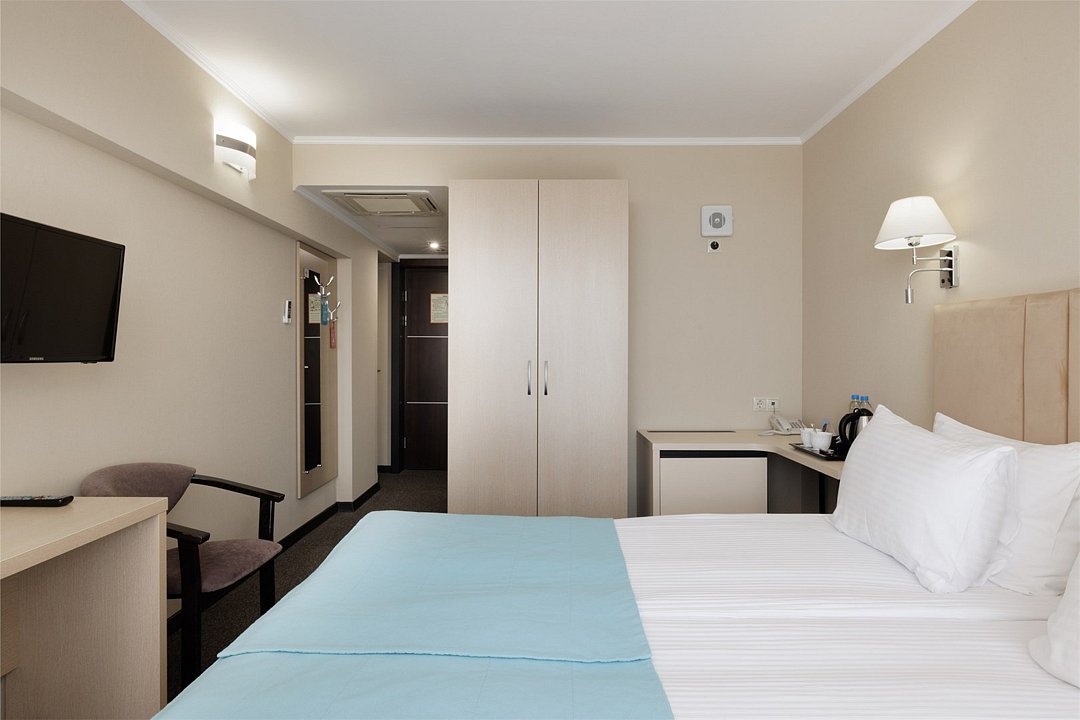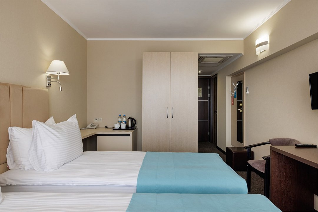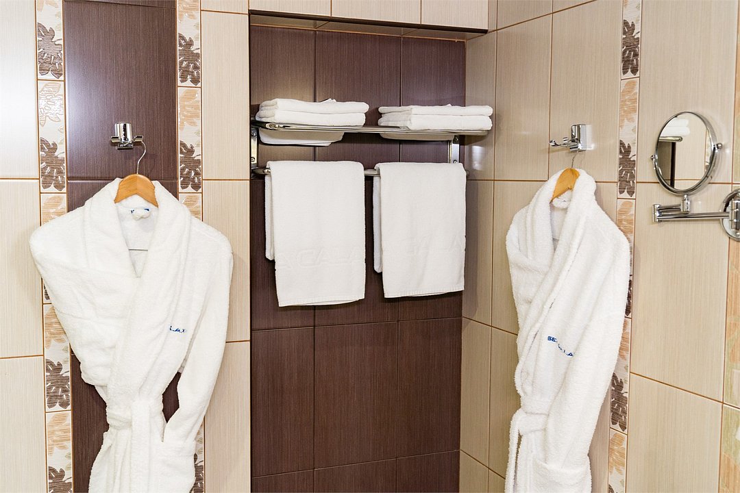 Представляем Вашему вниманию удобный однокомнатный номер в пастельных тонах, площадью 16 м2. Номер отлично подойдет для двухместного проживания, а кровати для вашего удобства мы можем объединить или наоборот установить их раздельно. Для вашего комфорта в каждом номере просторный балкон с потрясающим видом на Черное море и Сочи оснащен комплектом мебели для встречи уютных южных вечеров. Каждый номер оснащен кофе-машиной. Каждый номер укомплектован двумя прикроватными тумбами, шкафом для одежды, рабочей зоной состоящей из письменного стола и стула, оснащен настенной плазменной панелью, с широким выбором спутниковых тв каналов, сплит-системой для контроля температуры номере, электронным сейфом, светонепроницаемыми шторами, санузлом с душевой кабиной. Все номера Sea Galaxy Hotel Congress & Spa оснащены междугородней и международной телефонной связью, спутниковым телевидением, wi-fi. Каждый день в номерах производится уборка, белье и полотенца меняются один раз в три дня.Услуги и удобства