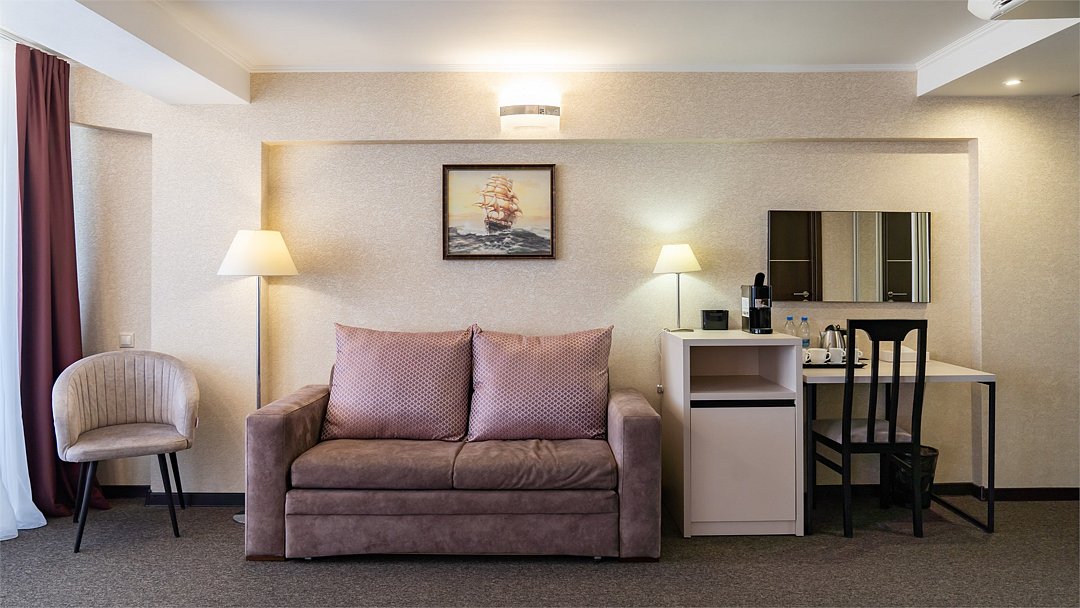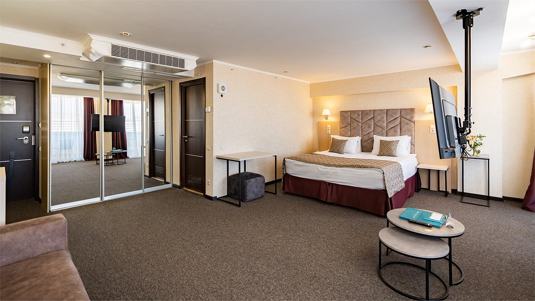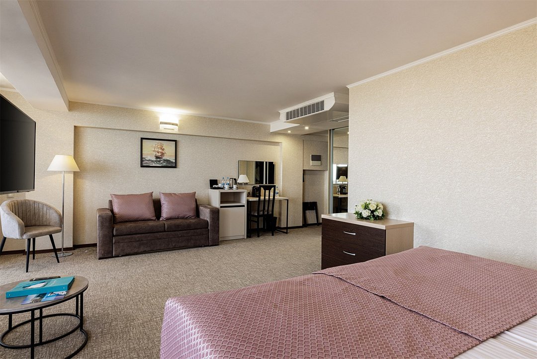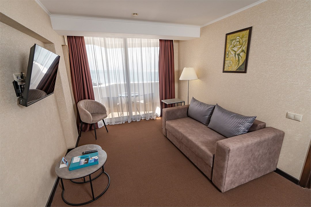 Представляем Вашему вниманию просторный номер свободной планировки Junior Suite. Номера площадью 32 м2 оформлены в пастельных тонах, располагаются на последних двух этажах отеля. В каждом номере два балкона с мебелью и лучший вид на Черное море и Сочи. Номер укомплектован всем необходимым для комфортного размещения одного или двух гостей, есть раскладывающийся диван, на котором можно разместить одно или два дополнительных спальных места. В каждом номере большая двуспальная кровать, прикроватные тумбы, встроенный шкаф для одежды, рабочая зона, состоящая из письменного стола и стула. Осветительные приборы в номере подобраны таким образом, что подобрать комфортное освещение проще простого. Каждый номер оснащен плазменной панелью, с широким выбором спутниковых тв каналов, сплит-системой для контроля температуры номере, электронным сейфом, светонепроницаемыми шторами, просторным санузлом с душевой кабиной и косметическим набором. В каждом номере кофе-машина. Все номера Sea Galaxy Congress Hotel & Spa оснащены междугородней и международной телефонной связью, Wi-Fi. Каждый день в номерах производится уборка, белье и полотенца меняются один раз в три дня.Услуги и удобства