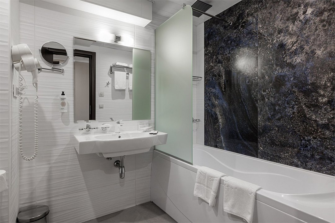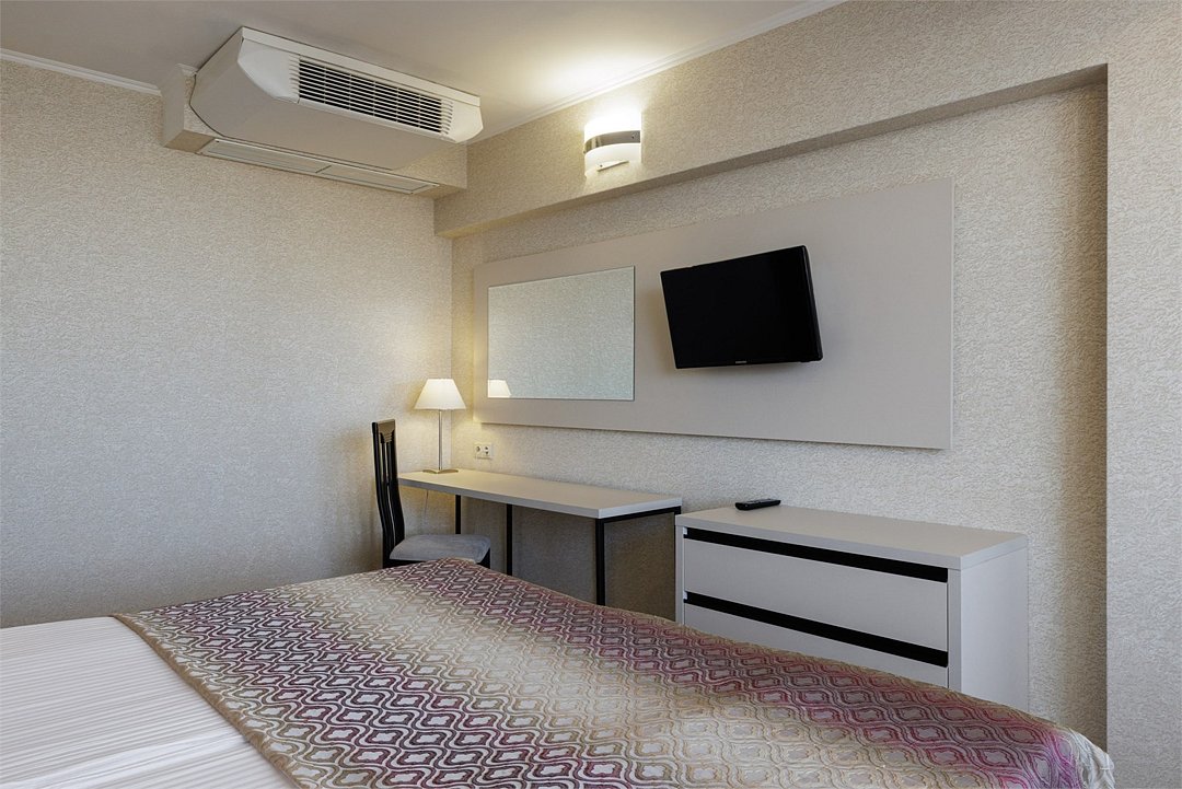 спутниковое телевидение, Wi-Fi, фен, утюг, радио, душевая кабина, санузел, халаты, банные полотенца, тапочки, гигиенические средства, косметические средства, балкон, две односпальные или большая двуспальная кровать, гладильная доска, тумбы, стулья, шкаф для одежды, журнальный столик, письменный стол, зеркало, сейф, раковина, ковровое покрытие, душ, вид на море, вид на город, кулер на этаже, раскладной диван, внутренний телефон, фанкойл, можно с питомцамиВ гостиничном номере