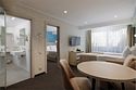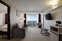 два телевизора, спутниковое телевидение, Wi-Fi, фен, утюг, радио, ванна или душевая кабина, санузел, банные полотенца, тапочки, балкон, две односпальные или большая двуспальная кровать, тумбы, стулья, шкаф для одежды, журнальный столик, зеркало, раковина, вид на море, вид на город, кулер на этаже, две спальни, две ванные комнаты, туалетные средства, внутренний телефон, фанкойл, чайная станция, межкомнатная дверь, можно с питомцамиВ гостиничном номере