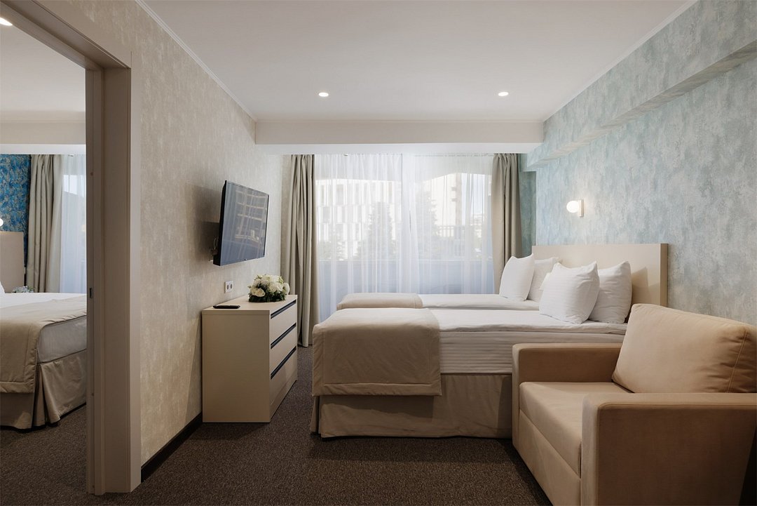 Представляем Вашему вниманию Семейный номер – оптимальный вариант для отдыха с детьми или небольшой компанией с живописным видом с каждого балкона. Элегантный дизайн в бежевых и бирюзовых оттенках создает уют и располагают к приятному отдыху. Площадь номера 34 м2. В двух изолированных комнатах расположены: спальная зона с большой двуспальной кроватью; два дополнительных спальных места и обеденная зона с мягкой мебелью; два меблированных балкона. Семейный номер также дополнен полностью оснащенной ванной комнатой. Этот двухкомнатный номер отлично подойдет для четырехместного проживания. В семейных номерах есть все необходимое для комфортного размещения: большая двуспальная кровать, две одноместных кровати, прикроватные тумбы, вместительные шкафы для одежды, мультимедиа TV, обеденная зона, состоящая из круглого стола и стульев. Номер укомплектован капсульной кофе-машиной. Все номера Sea Galaxy Congress Hotel & Spa, Сочи оснащены междугородней и международной телефонной связью. Каждый день в номерах производится уборка, белье и полотенца меняются один раз в три дня. Номер располагается на 4 этаже с видом на город.Услуги и удобства