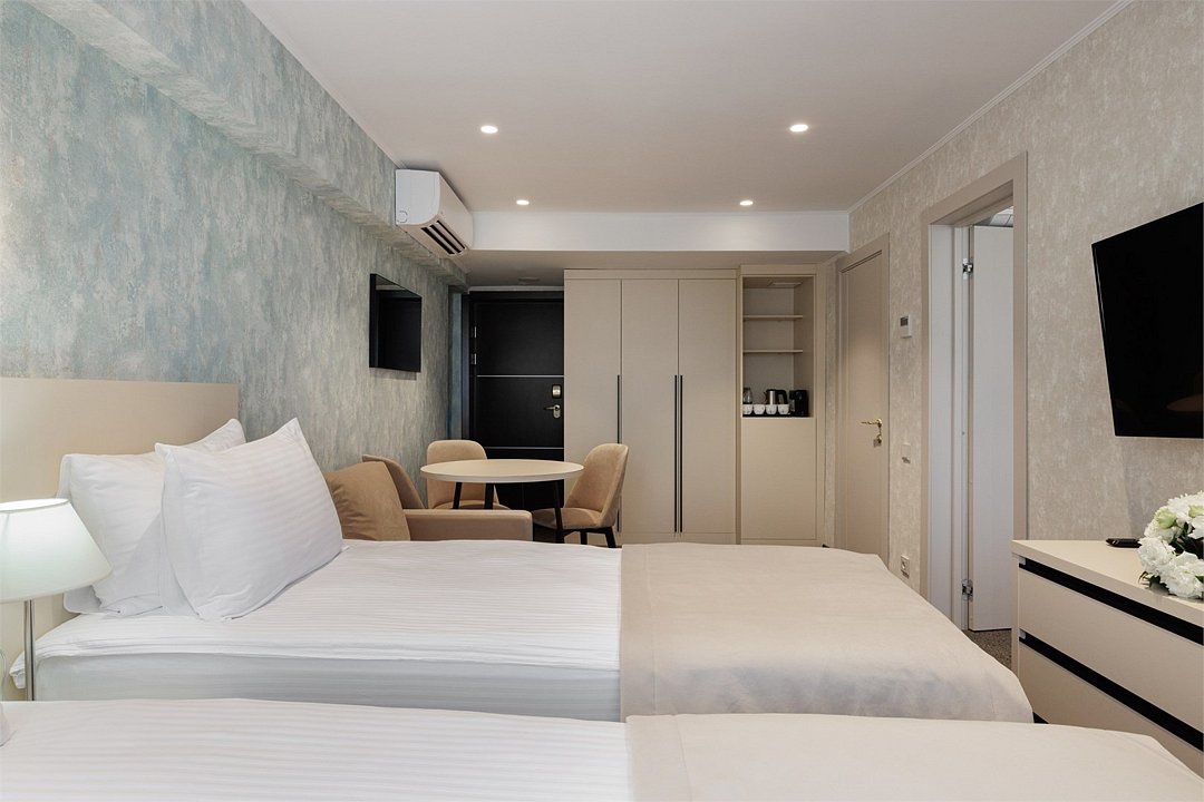 два телевизора, спутниковое телевидение, Wi-Fi, фен, электронные замки, утюг, радио, ванна или душевая кабина, санузел, биде, халаты, банные полотенца, тапочки, гигиенические средства, косметические средства, балкон, две односпальные или большая двуспальная кровать, тумбы, стулья, шкаф для одежды, журнальный столик, зеркало, сейф, раковина, вид на море, вид на город, кулер на этаже, кресло, две спальни, внутренний телефон, фанкойл, чайная станция, можно с питомцамиВ гостиничном номере