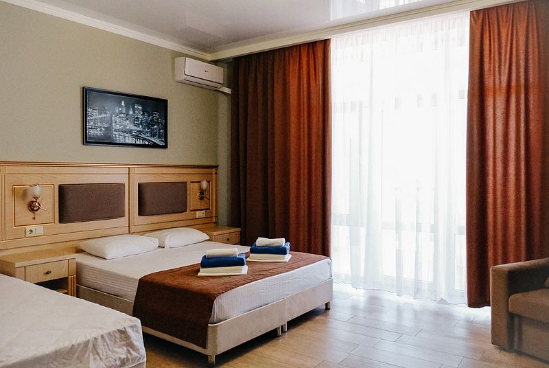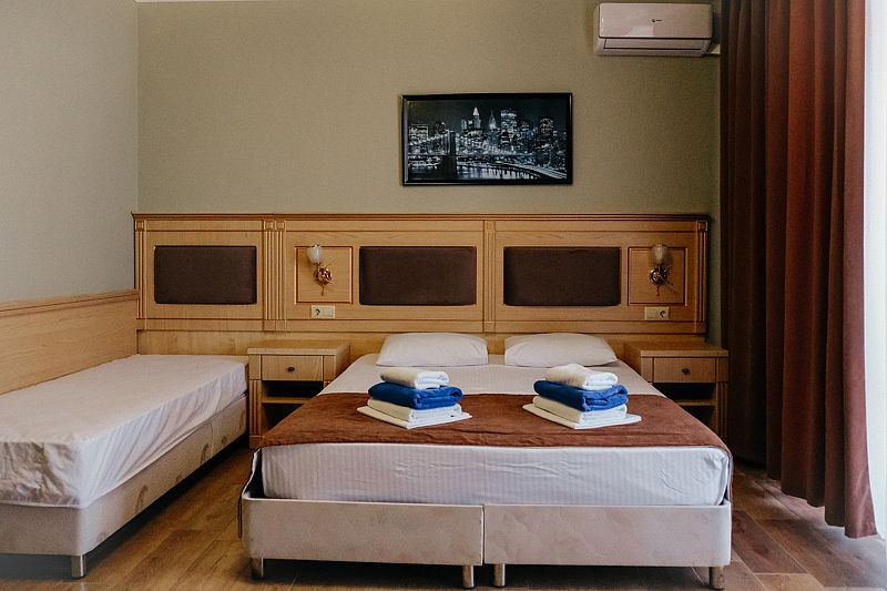 Трехместный номер площадью 26 кв. м с видом во двор. Подходит для размещения 4 человек. (3 основных места и 1 дополнительное). Имеет спальню с приятным интерьером.