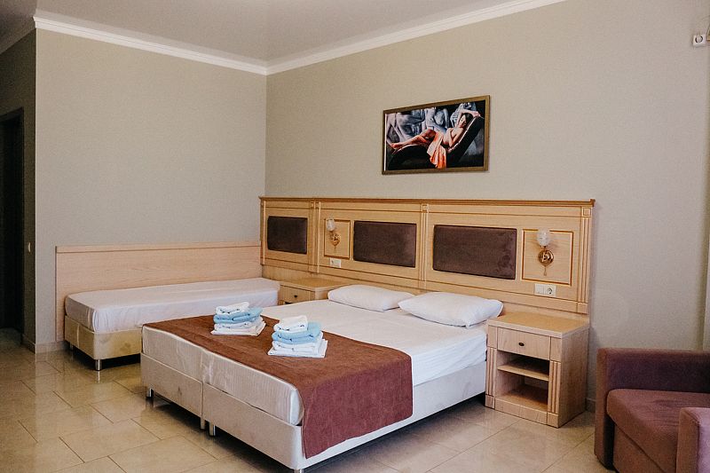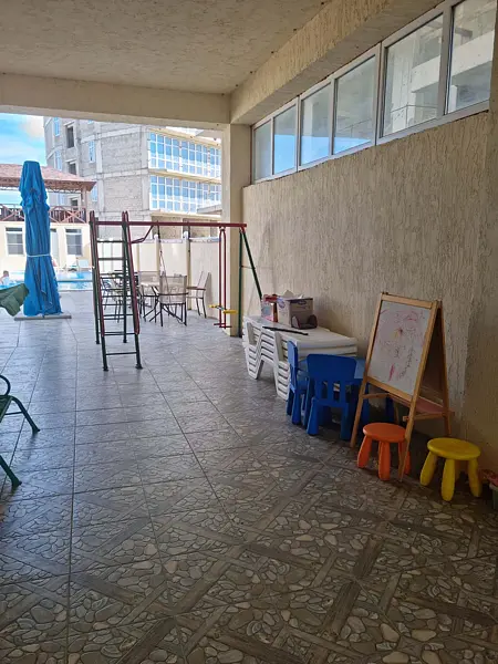 Путешествие с семьейОтдых июль 2022Отдыхали с семьёй с 11 по 18 июля 2022г. Встретили тепло, убирались в номере чаще чем хотелось, молодцы, претензий нет. Бассейн большой, всегда чистый. Море рядом. Самое лучшее в отеле это столовая, вкуснейшая еда как дома, доброжелательный коллектив, им спасибо большое. Завтрак, обед и ужин пальчики оближешь. Вернулась только бы в столовую. В самом отеле, а именно в номере мне не хватило ковриков, так как полы плитка, холодно ходить. В ванной комнате нет тазика для белья и половой тряпки. В номере нет посуды. И хотелось чтоб была комната , чтоб можно было приготовить или разогреть еду. Надеюсь примете замечания во внимания. Про анимацию детей вообще ничего не было за неделю, а то что днем с детьми рисовали это не считается. Обидно. Цена за проживания завышена, из-за этого пришлось переехать туда где все есть и цена ниже. Всего хорошего и процветания. Да и пляж был отвратительный весь в ракушках, больно ходить.